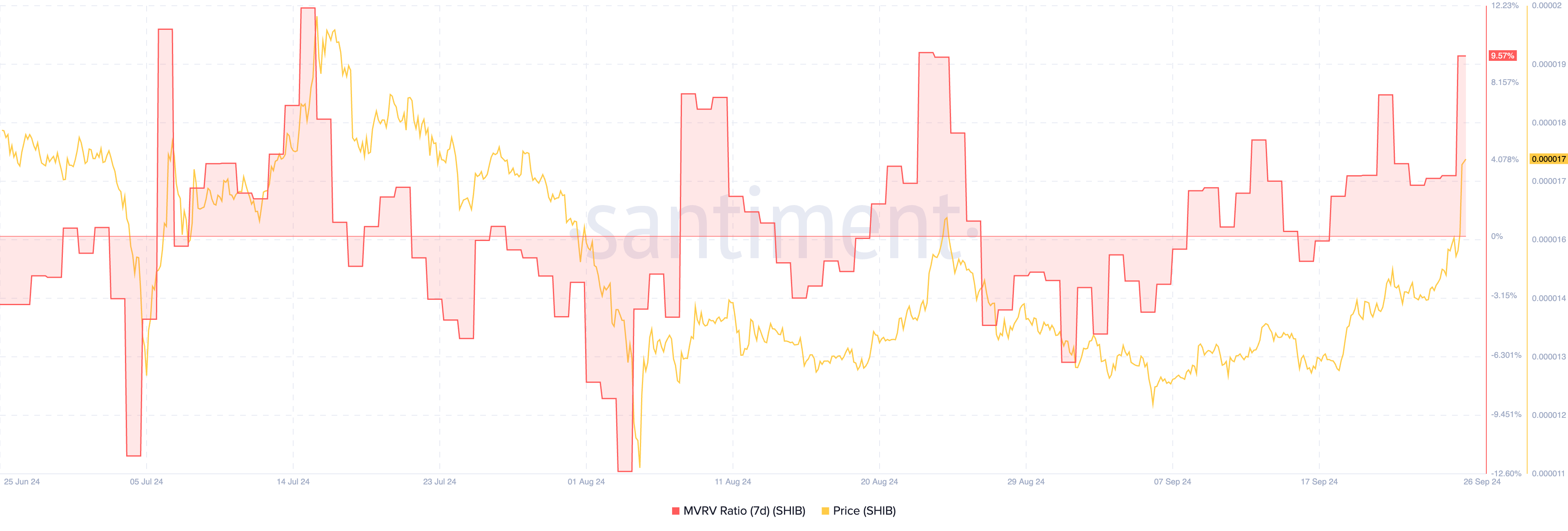 Shiba Inu, einer der führenden Memecoins, erlebte kürzlich einen sprunghaften Anstieg seines 7-Tage-Marktwert-Verhältnisses von 3,1 Prozent auf 9,57 Prozent innerhalb von 24 Stunden, verbunden mit einem Kursanstieg von 12 Prozent. Dieser Anstieg zeigt, dass ein erheblicher Teil der SHIB-Inhaber inzwischen Gewinne erzielt. Die MVRV-Ratio misst den durchschnittlichen Gewinn oder Verlust der im Umlauf befindlichen Token im Verhältnis zu ihren Anschaffungskosten in den letzten sieben Tagen und hilft bei der Einschätzung der kurzfristigen Rentabilität.