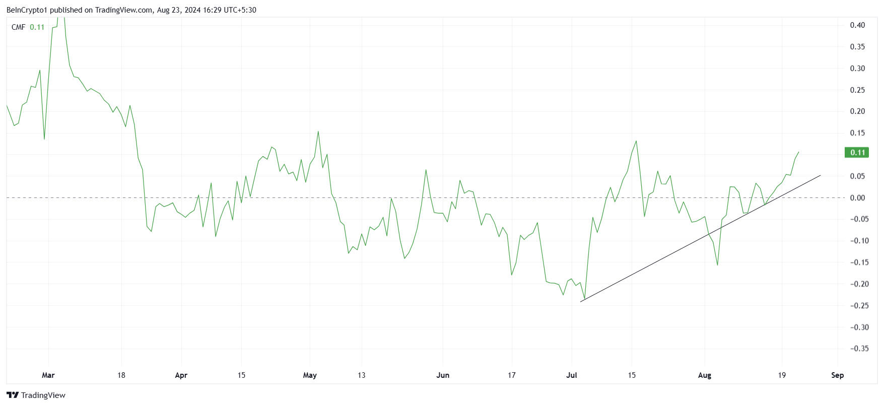Zudem zeigt der Chaikin Money Flow (CMF) Indikator, dass SHIB-Zuflüsse in den letzten eineinhalb Monaten stark waren. Konstante Zuflüsse deuten darauf hin, dass kontinuierlich Kapital in das Asset fließt, was seine Erholung und das Potenzial für zukünftiges Wachstum weiter unterstützt.