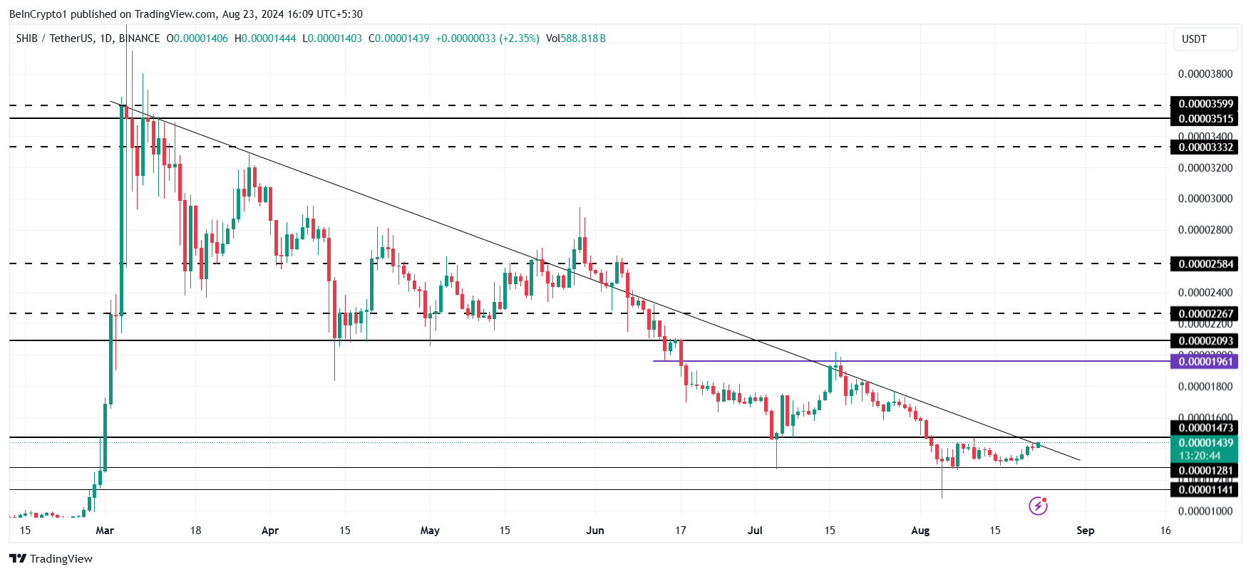 Der SHIB Kurs liegt bei 0,00001439 USD und zielt darauf ab, den Widerstand von 0,00001473 USD in eine Unterstützung umzuwandeln. Dies würde einen Anstieg des Memecoins auslösen und helfen, SHIB von dem fünf Monate alten Abwärtstrend zu befreien und eine Erholung einzuleiten.