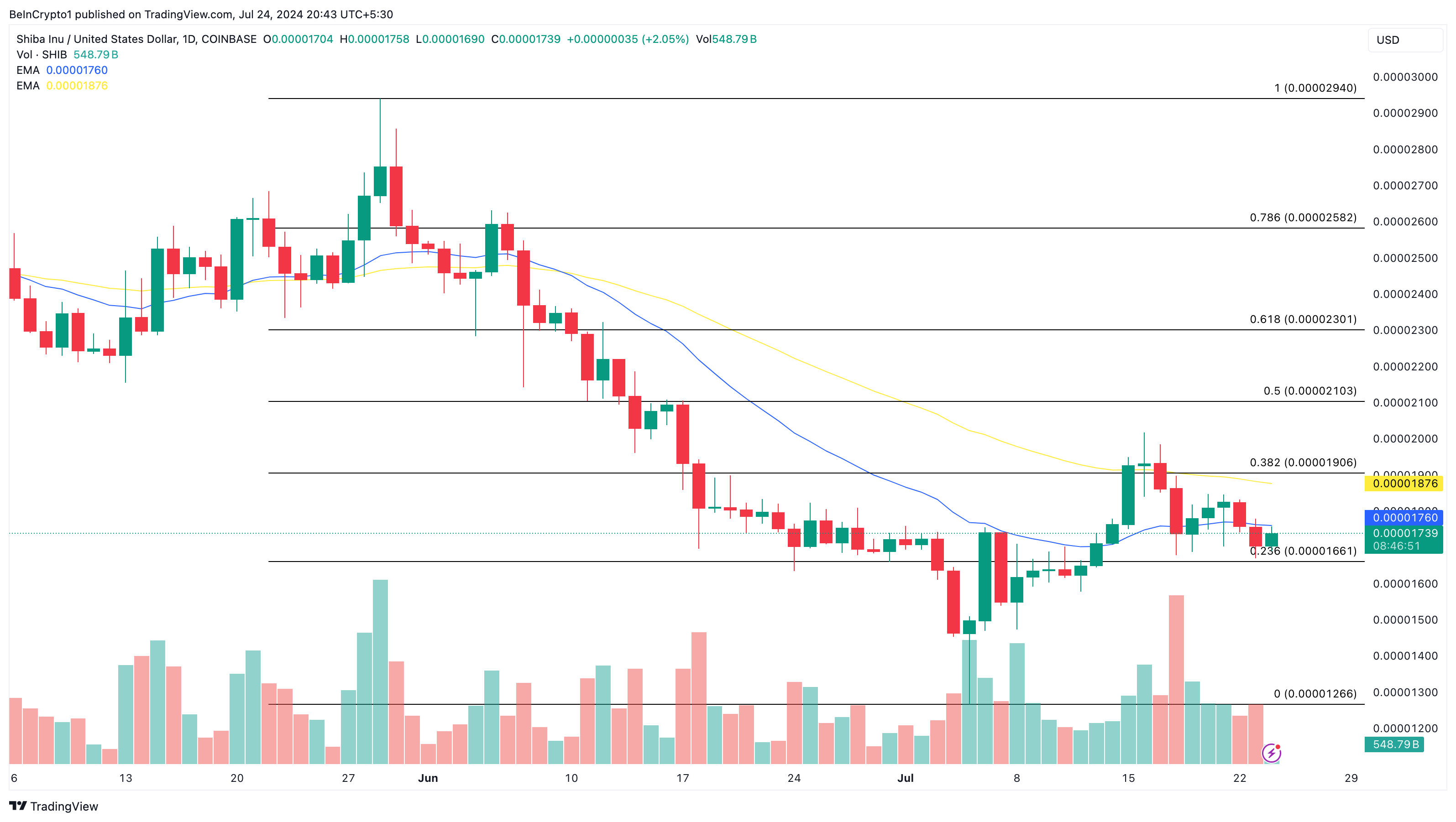 Wenn das anhält, könnte es für SHIB schwierig werden, einen Sprung zu machen. Außerdem liefert der Fibonacci-Retracement-Indikator wahrscheinliche Kursziele, die SHIB erreichen könnte. Aus dem obenstehenden Diagramm geht hervor, dass der Kurs auf 0,000016 USD fallen könnte, falls er nicht über die kurzfristigen EMAs steigt.