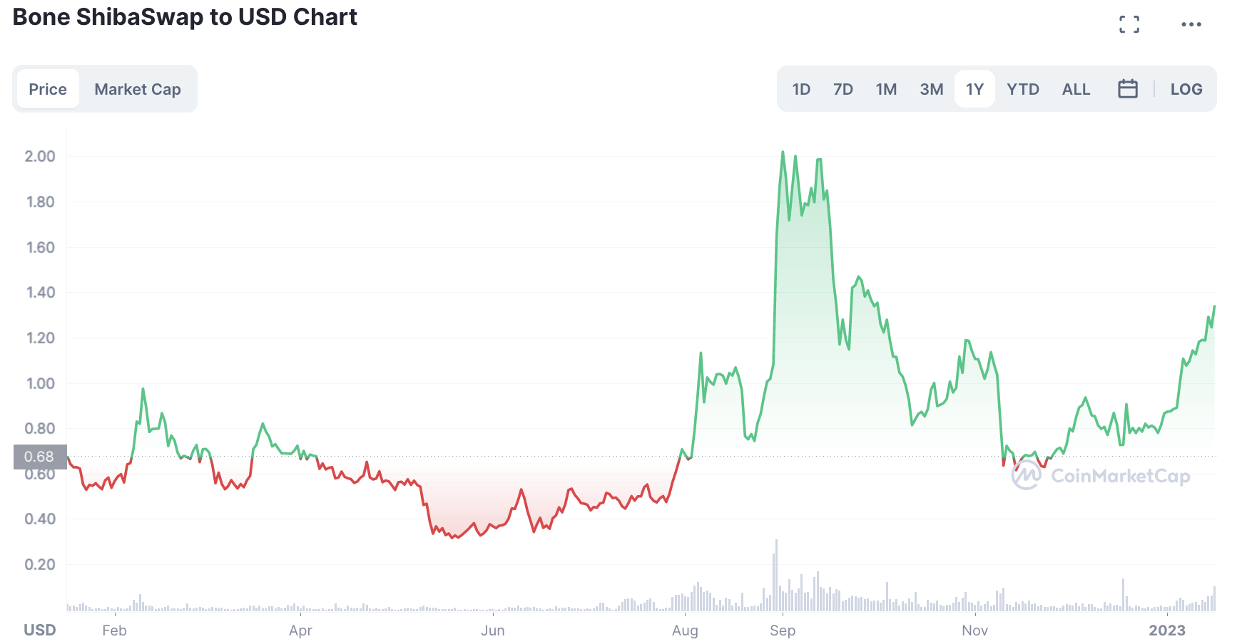 Der Preis von Bone ShibaSwap (BONE) zog in den letzten 24 Stunden um über 15 % an und liegt nun bei 1,34 US-Dollar. Zuvor hatte er das 24-Stunden-Hoch bei 1,42 US-Dollar erreicht.