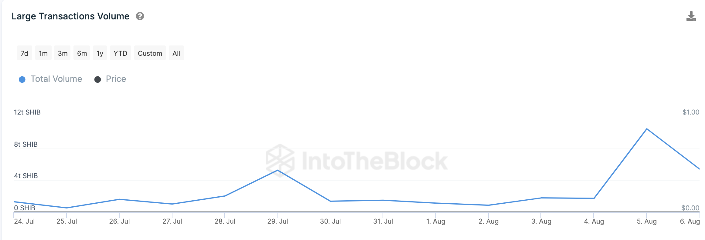 Laut IntoTheBlock schoss das Shiba Inu (SHIB) Transaktionsvolumen in der Nacht vom 4. auf den 5. August um 8,71 Milliarden SHIB in die Höhe. Dieser unglaubliche Anstieg gipfelte in einem Höchstwert von insgesamt 10,44 Billionen Token, bevor der Wert wieder auf aktuell 5,4 Milliarden zurückfiel.