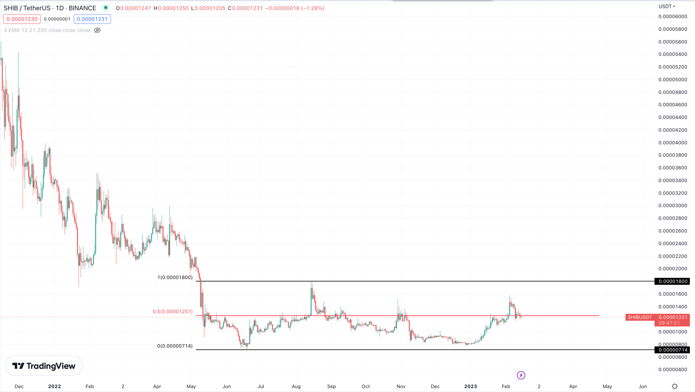 Nachdem der SHIB-Kurs über die letzte Woche einen Wertverlust von knapp 23 % erlitten hatte, hält er sich aktuell bei 0,00001223 US-Dollar und ist damit 85,95 % von seinem Allzeithoch im Oktober 2021 entfernt.