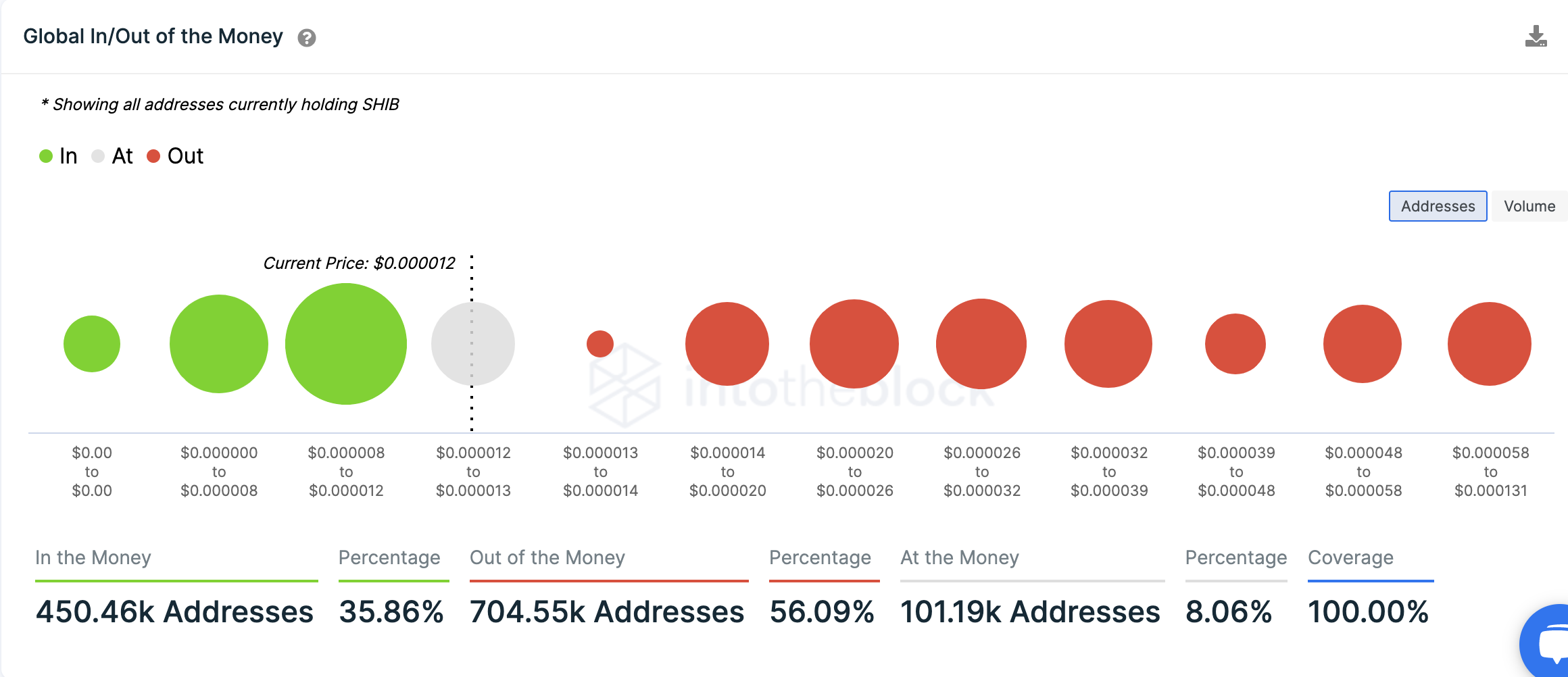 Wie ein Blick auf IntoTheBlock In/Out of Money Indikator zeigt, verzeichnen 35,86 % aller SHIB-Adressen aktuell einen Profit. Angesichts der bärischen Makrostruktur wäre ein weiterer Abverkauf also durchaus möglich.