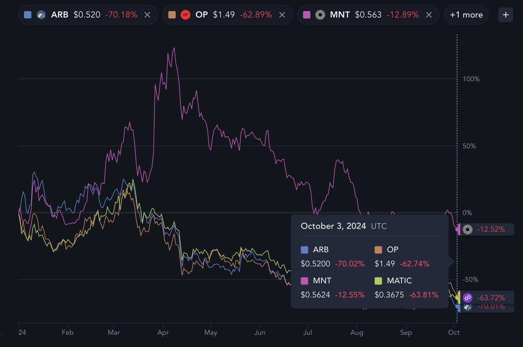 Die vier größten Skalierungslösungen — Arbitrum, Polygon, Mantle und Optimism — verzeichnen dieses Jahr erhebliche Rückgänge, wobei Optimism (OP) mit -62,74 Prozent den stärksten Einbruch erleidet. Dieser starke Rückgang zeigt die wachsenden Herausforderungen innerhalb des Ökosystems der Skalierungslösungen, das einst als entscheidend für die Überwindung der Einschränkungen von Ethereum galt.