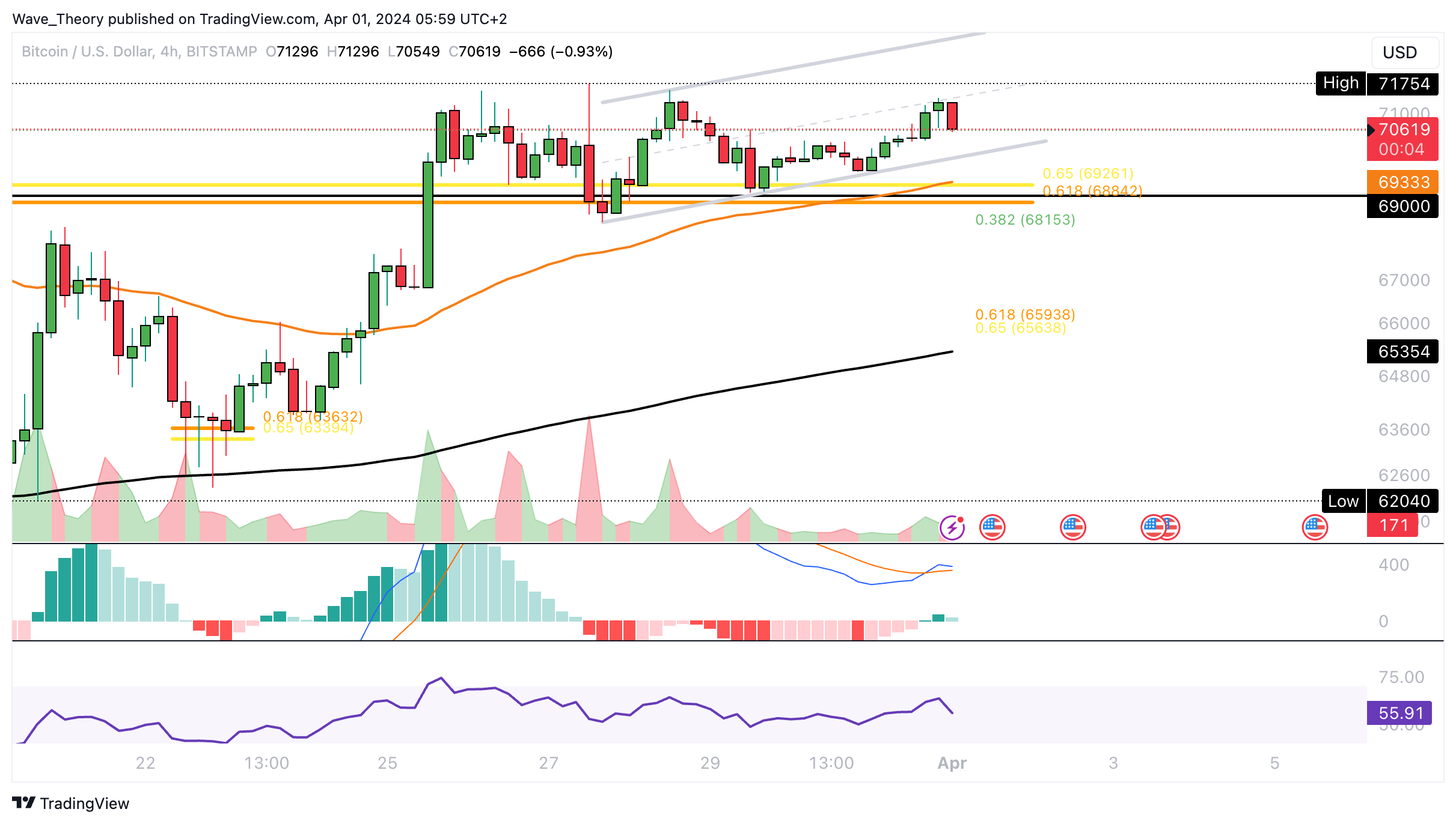 Im 4H-Chart wird deutlich, dass BTC jetzt zur Golden Ratio Unterstützung bei rund 69.000 USD korrigieren könnte. Dort fungiert der 50-4H-EMA als zusätzliche Unterstützung.