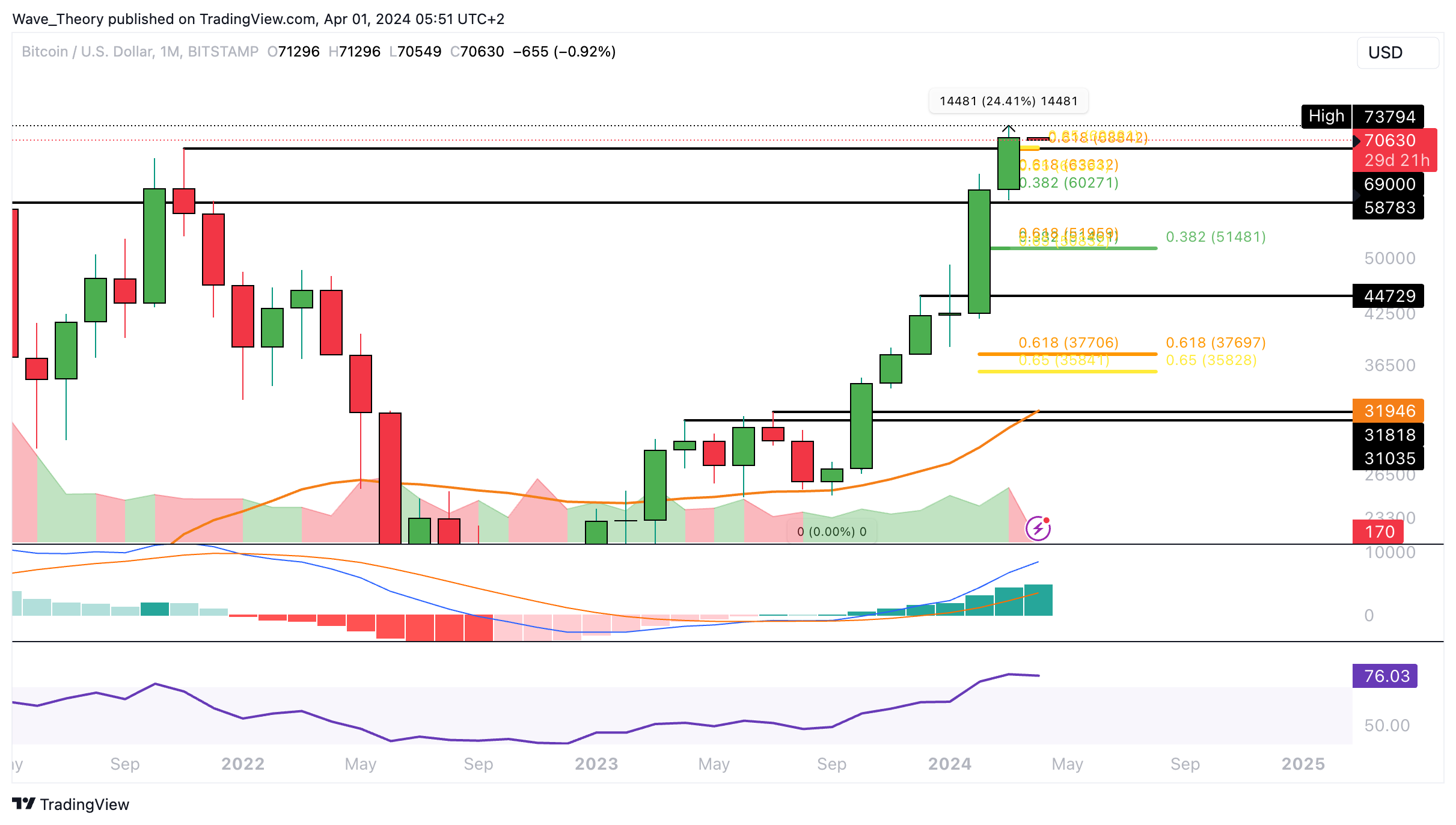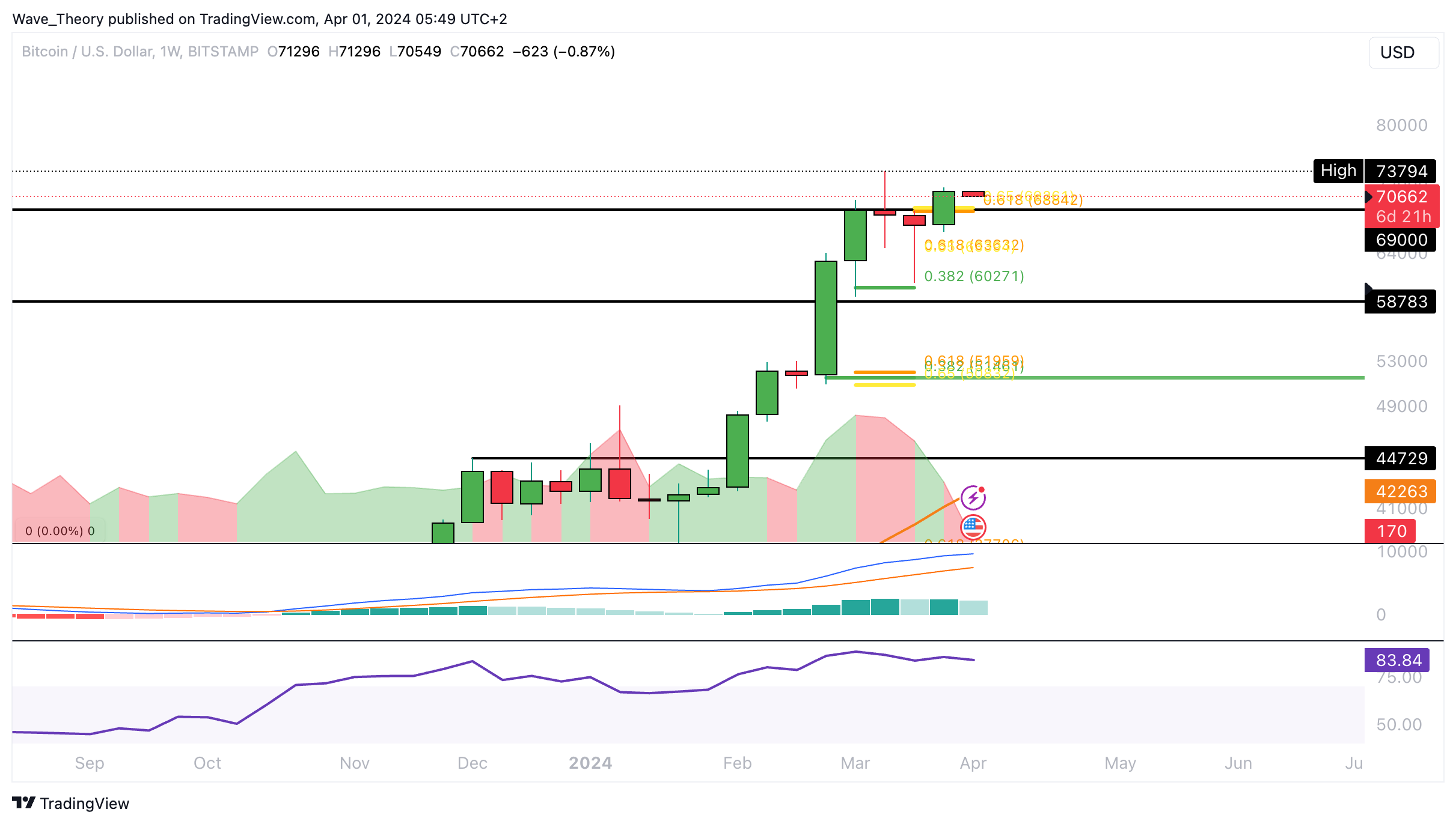 Dementsprechend könnte Bitcoin jetzt zur Golden Ratio bei rund 69.000 USD zurückkehren, welche nun als Unterstützung dient. Nach oben hin fungiert das ATH bei rund 73.800 USD als signifikanter Widerstand.
