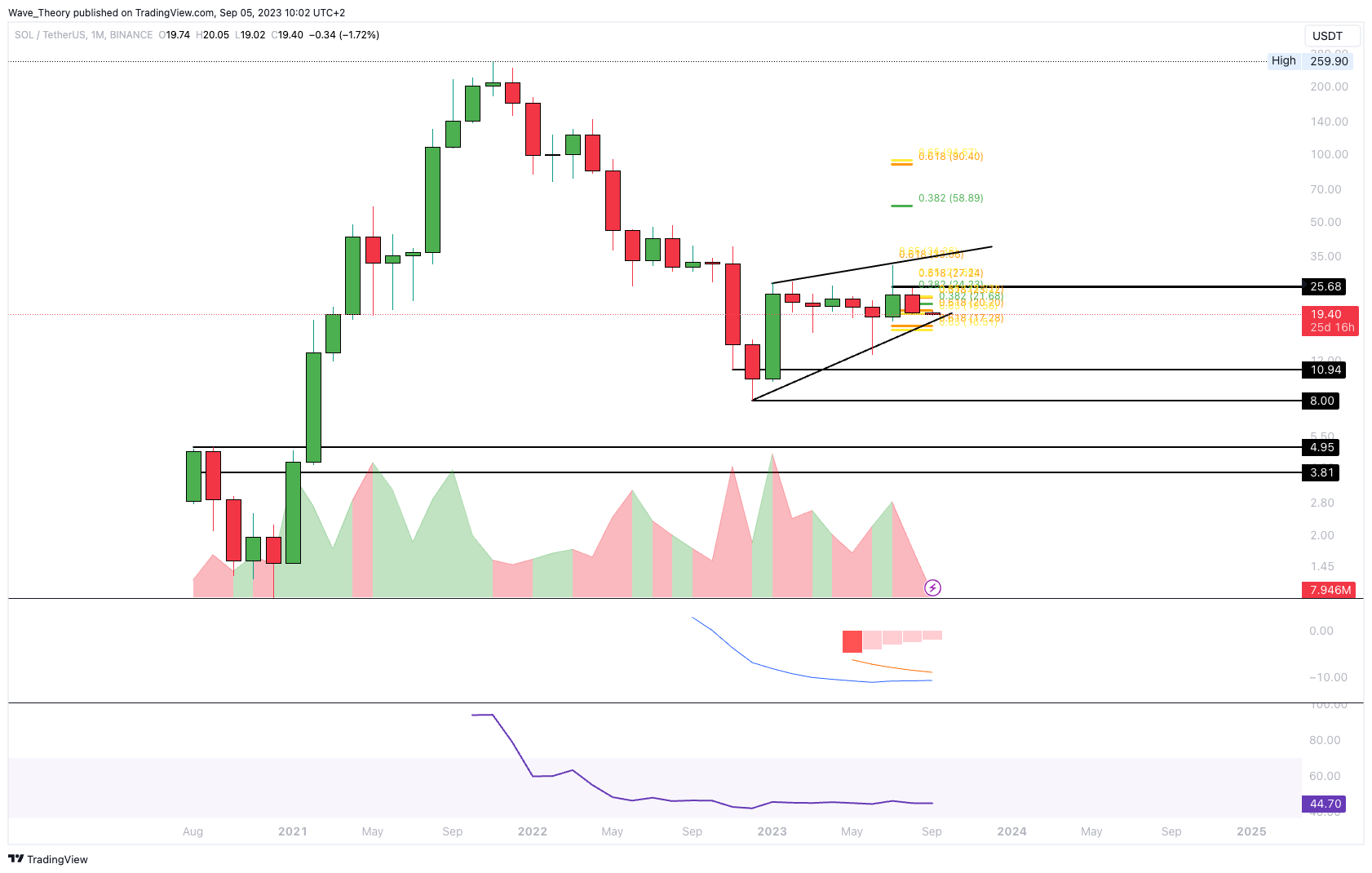 Gegen BTC könnte der SOL Kurs jetzt zur Golden Ratio Unterstützung bei rund 0,000695 BTC zurückkehren. Das impliziert ein Abwärtspotenzial von rund 9,3 %. Im Monatschart weist das Histogramm des MACDs aber immer noch einen Aufwärtstrend auf, obschon die MACD Linien bärisch überkreuzt sind.
