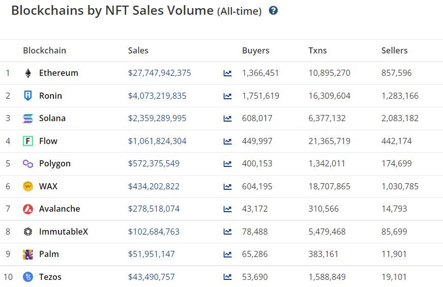In Sachen NFT-Verkaufsvolumen rangiert Solana mittlerweile nur noch hinter Ethereum und Ronin, Tendenz steigend. Da Ronin mit dem Vorzeigeprojekt Axie Infinity vor kurzem gehackt wurde, steht Solana bei Monatsbetrachtung sogar auf Platz 2. Die Solana NFT-Sales sind größter als die der direkten DeFi-Konkurrenten Avalanche oder Cardano.