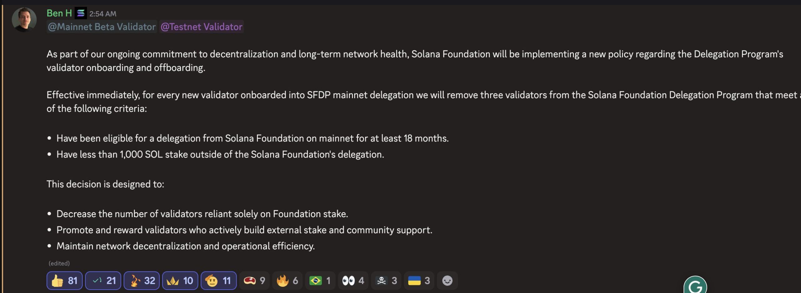 Sponsored„Ab sofort werden für jeden neuen Validator, der in die SFDP-Mainnet-Delegation aufgenommen wird, drei Validatoren aus dem Solana Foundation Delegation Program entfernt, die alle folgenden Kriterien erfüllen“, schrieb er.
