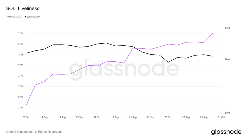 On-Chain-Daten zeigen zunehmende Bärischkeit unter den langfristigen Haltern (LTHs). Solanas Liveliness-Metrik ist in den letzten Wochen gestiegen, was auf eine Zunahme von Coins hinweist, die ruhende Wallets verlassen. Dieses Verhalten deutet darauf hin, dass LTHs Vermögenswerte abstoßen, Überzeugung verlieren und Druck auf die Kursentwicklung des Altcoins ausüben.