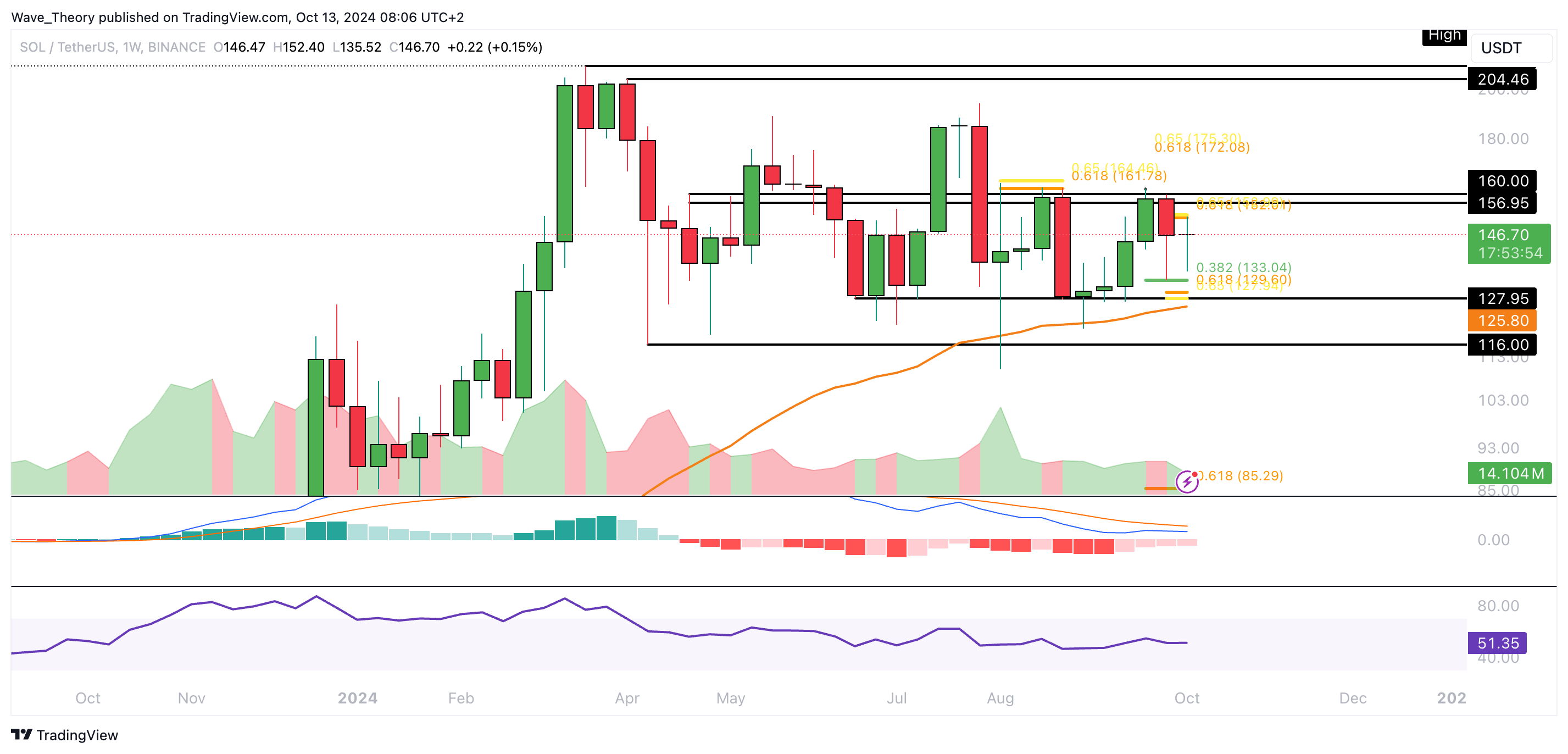 Zuvor erlebte der SOL Kurs eine längere Aufwärtsbewegung, stieß dann aber zwischen rund 157 USD und 160 USD auf Widerstand und korrigierte zur 0,382 Fib Unterstützung bei rund 133 USD.