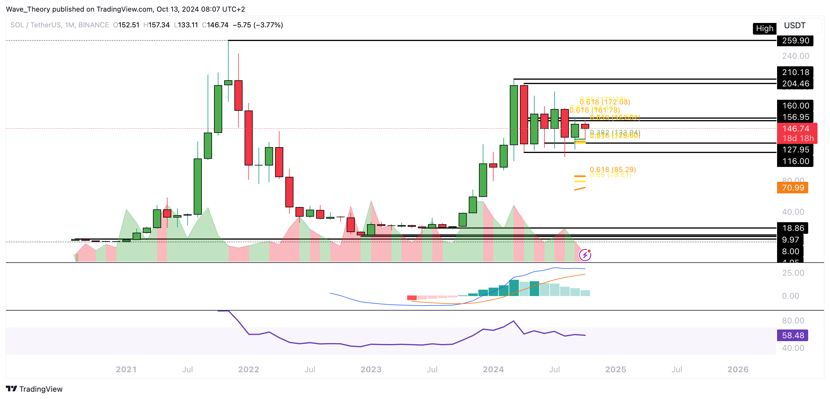 Um die Korrekturbewegung vollständig hinter sich zu lassen, muss Solana die Golden Ratio Widerstände bei rund 162 USD und 175 USD brechen. Die Indikatoren im Monatschart zeichnen dabei aber eher ein bärisches Bild.