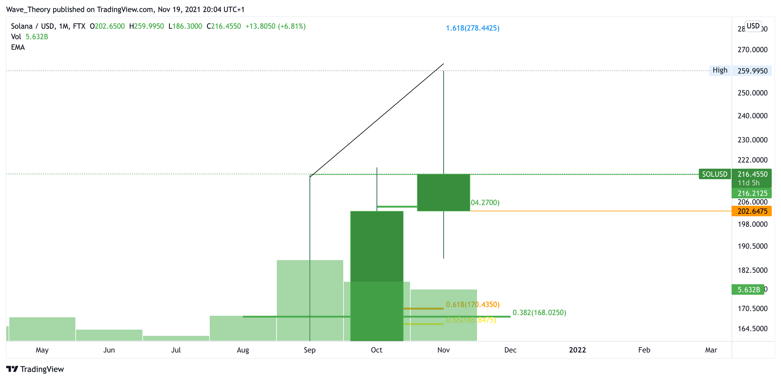 Im Monatskurs zeigt sich Solana nach wie vor bullisch. Solana muss diesen Monat lediglich über 202 USD schließen, damit die Kerze grün bleibt. Zwar ist das kein Garant auf eine Fortsetzung des Aufwärtstrends, aber dennoch ein gutes Zeichen. Die Korrektur von Solana könnte eher vorbei sein als von Bitcoin und anderen Kryptowährungen.