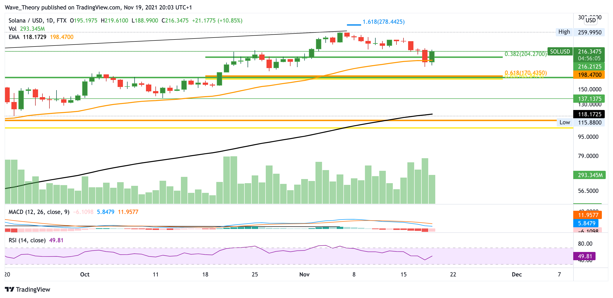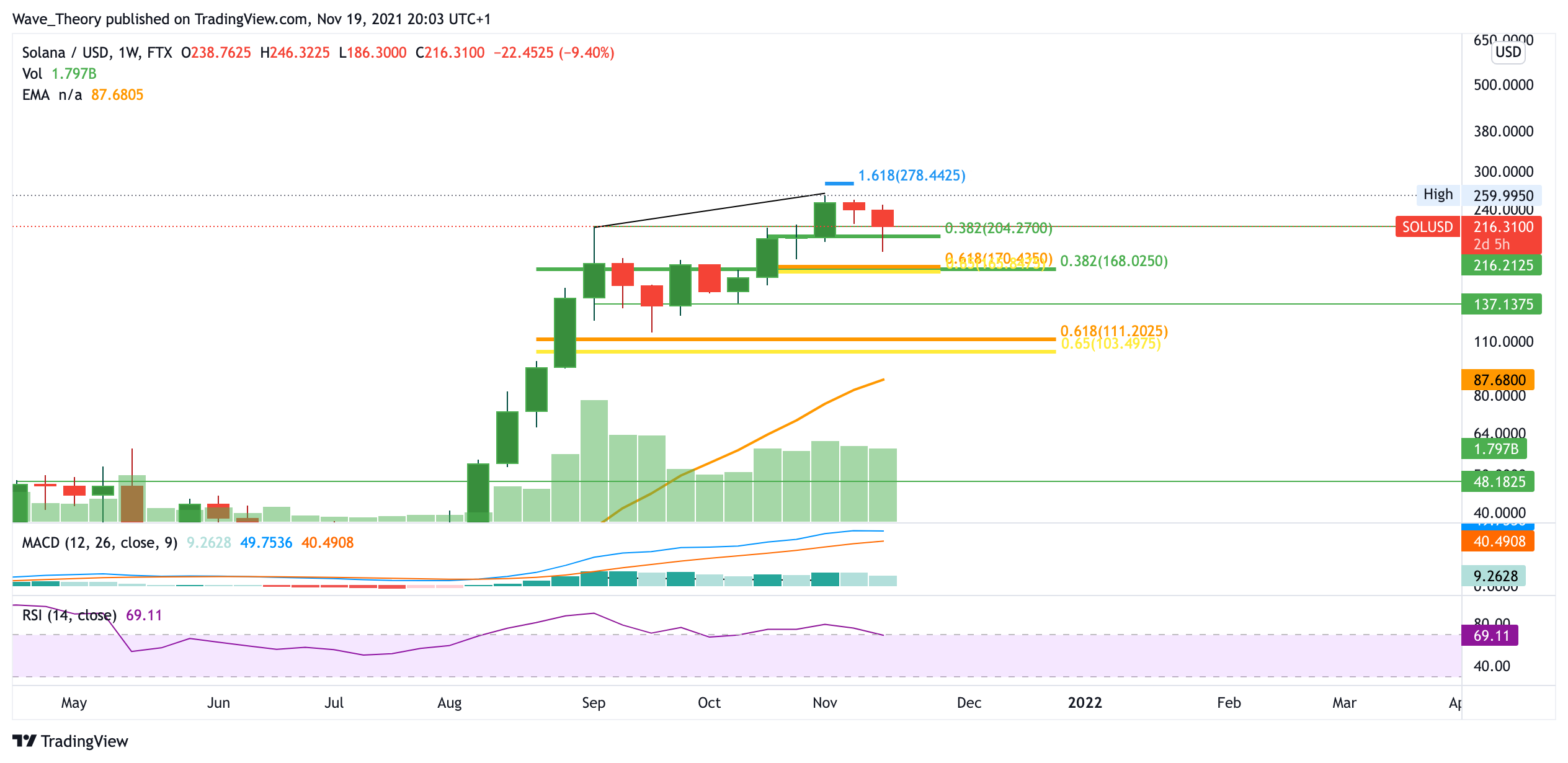 Im Solana Wochenchart baute sich wochenlang eine bärische Divergenz im RSI auf, welche sich nun auflöste, bevor Solana das Fibonacci Niveau bei 278 USD erreichte. Tatsächlich stieg der Solana Kurs nur bis rund 260 USD. Anschließend leitete Solana letzte Woche eine Korrektur ein. Grundsätzlich könnte Solana bis zur Golden Ratio bei rund 170 USD korrigieren. Spätestens bei 110 USD und rund 140 USD findet Solana zudem massive Unterstützungen. Der MACD und der RSI lassen die Möglichkeit offen, dass die Abwärtsbewegung fortgesetzt wird. Schließlich tickt das Histogramm die letzten zwei Wochen tiefer und der RSI befindet sich noch immer in überkauften Regionen.