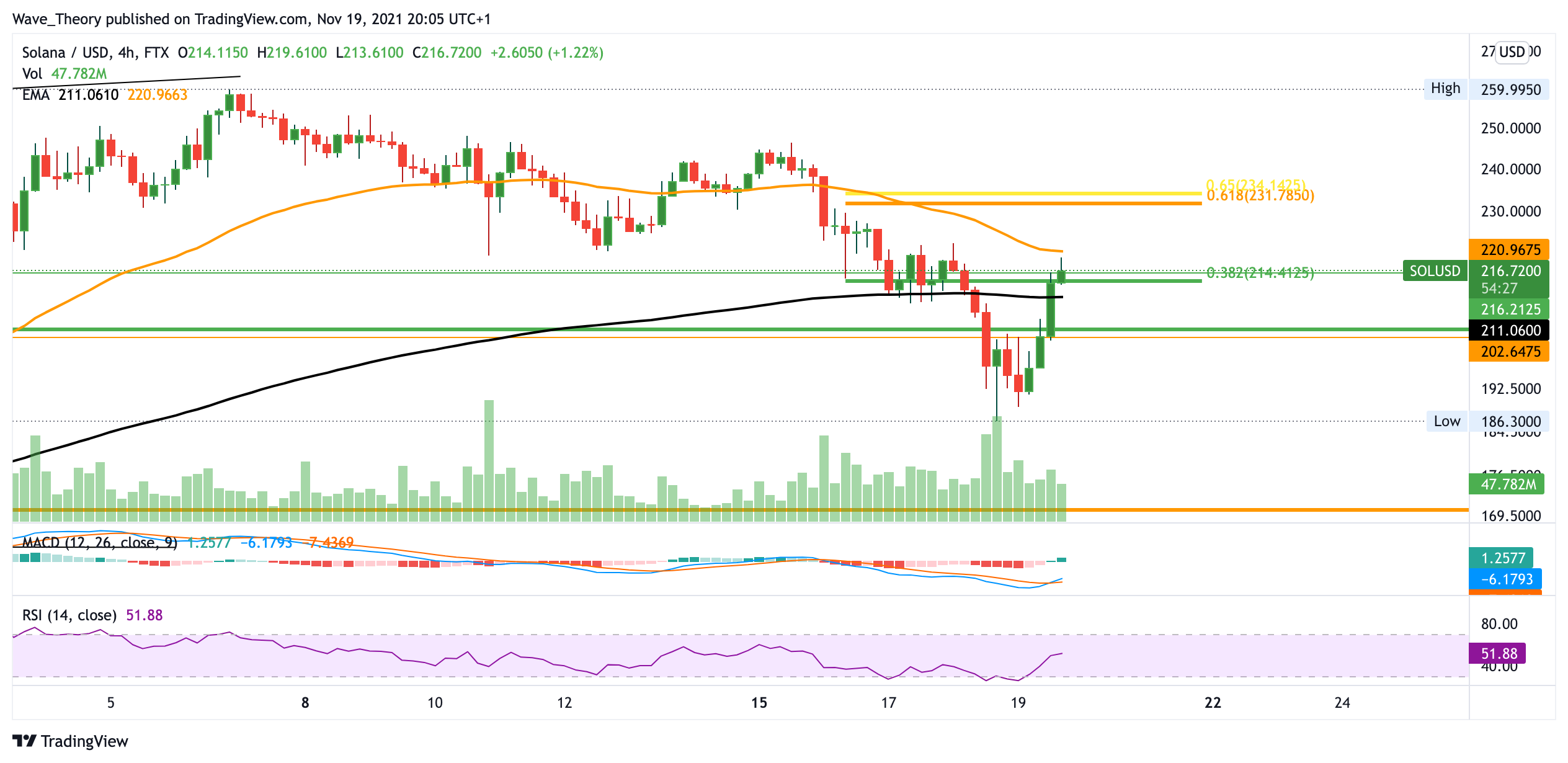 Jedoch stößt Solana bereits bei 220 USD und bei rund 230 USD auf signifikante Widerstände. Ansonsten zeigt sich der MACD aber auch im 4H Kurs bullisch und auch die EMAs sind noch bullisch überkreuzt.