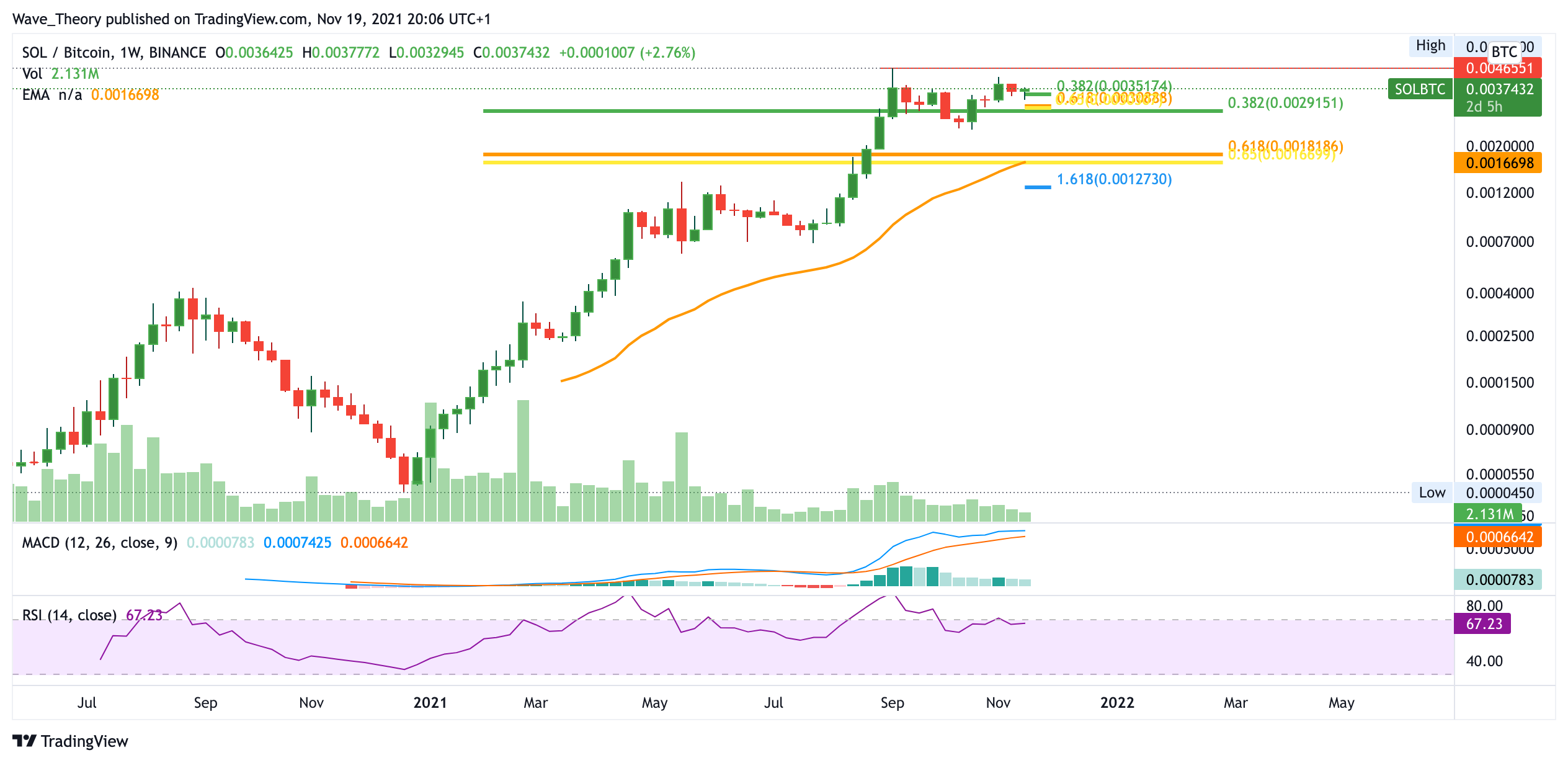 Gegen Bitcoin findet Solana bei 0,0035, BTC und 0,003 BTC Unterstützung. Ansonsten wartet spätestens bei 0,0017 BTC massive Unterstützung auf den Solana Kurs, denn dort kreuzt der 50-Wochen-EMA die Golden Ratio Unterstützung. Nach oben hin wartet am ATH bei 0,0046 BTC Widerstand auf den SOL Kurs.