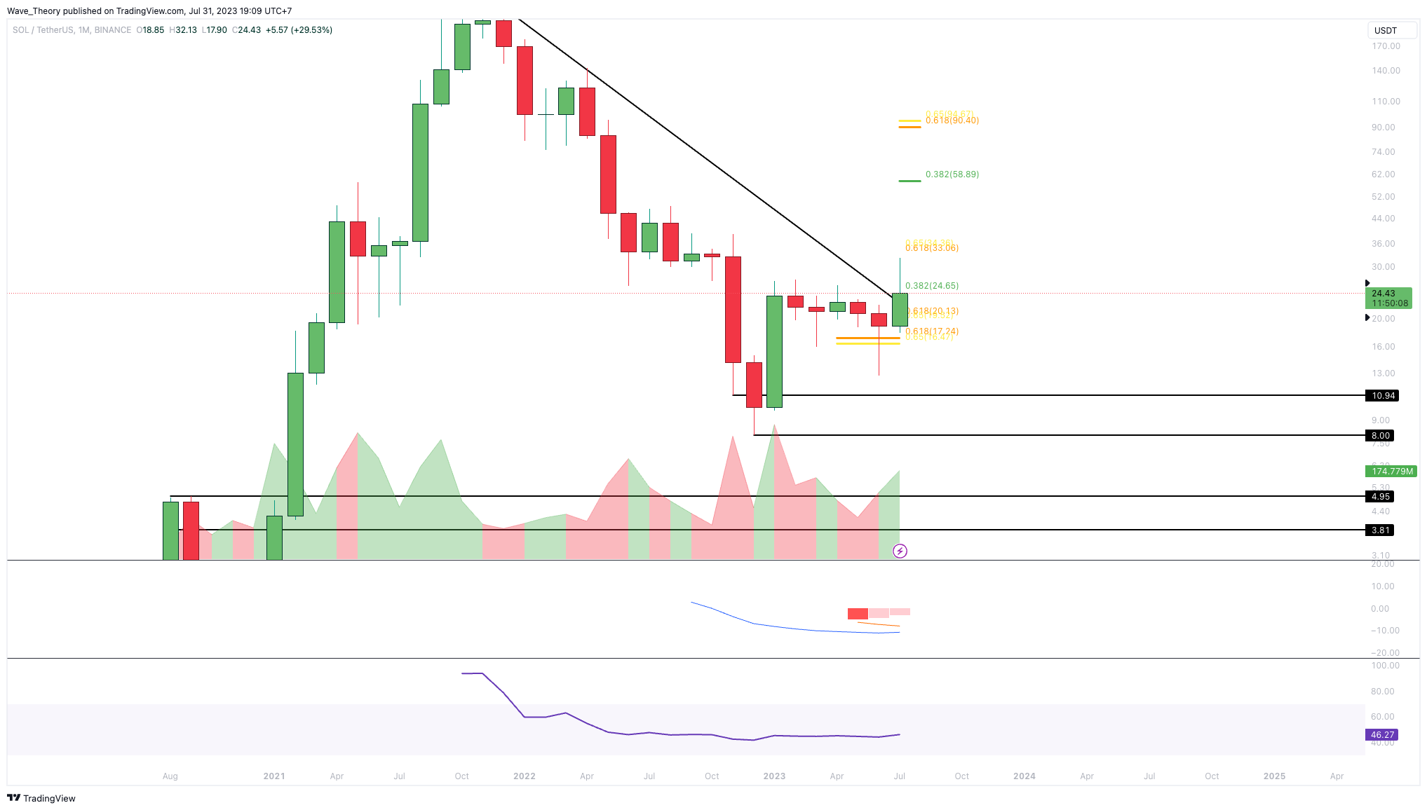 In wenigen Stunden schließt die Monatskerze. Tatsächlich könnte die Monatskerze unter der bärischen Trendlinie schließen, wenn der Solana Kurs bis heute Nacht nicht über dem Preisniveau von rund 24,3 USD steht. Das wäre ein bärisches Signal für den kommenden Monat.