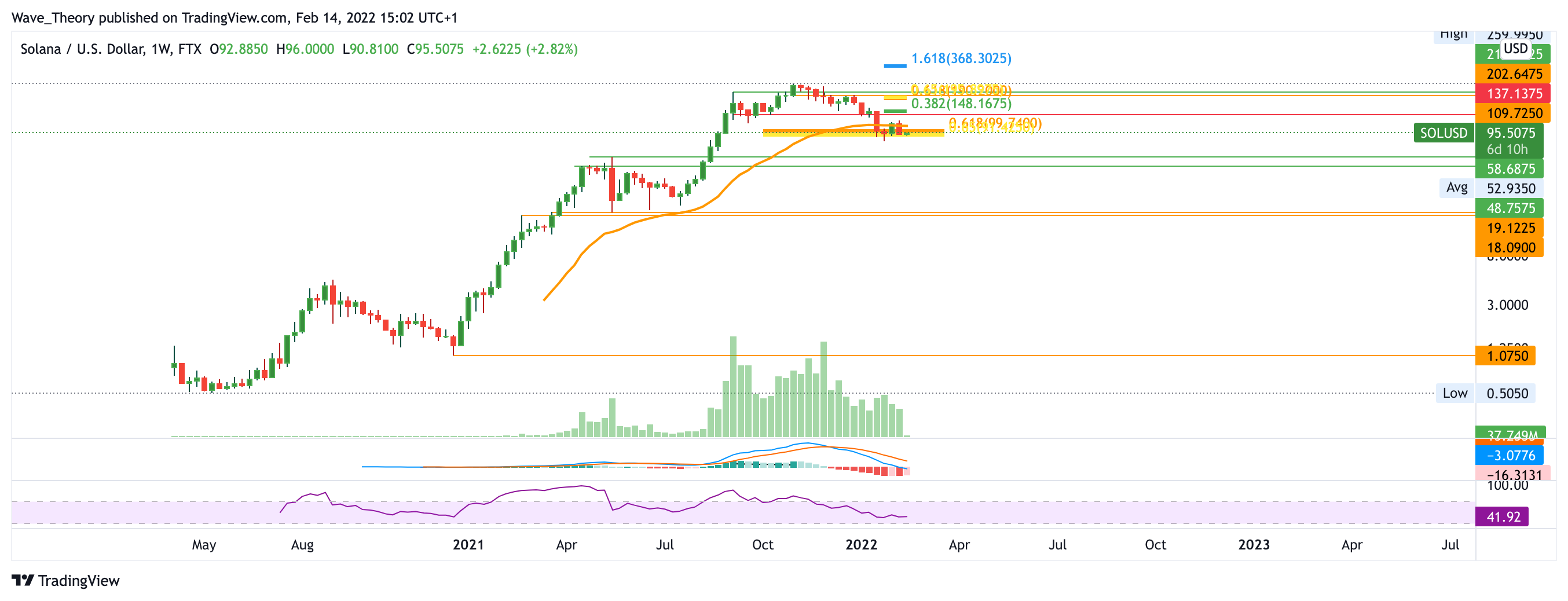 Im Tageskurs formte der Solana Kurs nun ein Death Cross, was den Trend grundsätzlich mittelfristig bärisch bestätigt. Dennoch kann es zu einer sofortigen Negation kommen, sofern der Solana Kurs jetzt erneut an der Golden Ratio bei rund 100 USD abprallt. Aktuell sieht es danach aus, dass der SOL Kurs einen höheren Tiefpunkt an der Golden Ratio Unterstützung formt. Sollte Solana erneut daran abprallen, könnte der SOL Kurs bis 137 – 150 USD steigen. Dort stößt Solana dann auf signifikanten Widerstand. Der MACD zeigt sich im Wochenkurs jedoch eher bärisch: das Histogramm tickt bärisch tiefer, während die MACD Linien bärisch überkreuzt sind.
