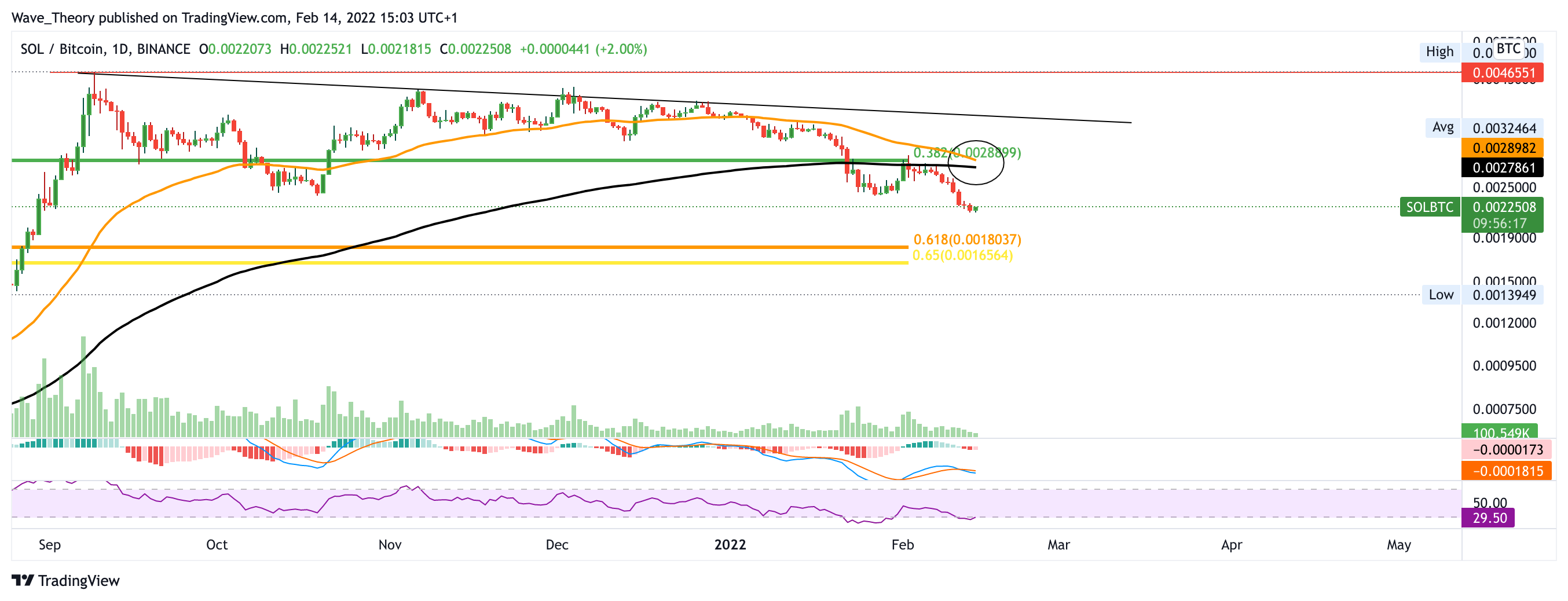 Gegen BTC steht dem SOL Kurs ebenfalls ein Death Cross im Tageschart bevor. Jedoch könnte Solana nun schon sehr bald die Golden Ratio Unterstützung bei rund 0,0018 BTC erreichen und daran stark abprallen. Der RSI formt aktuell bereits eine bullische Divergenz und auch der MACD entwickelt sich tendenziell bullisch. Die Chancen für einen baldigen Anstieg stehen also sehr gut!