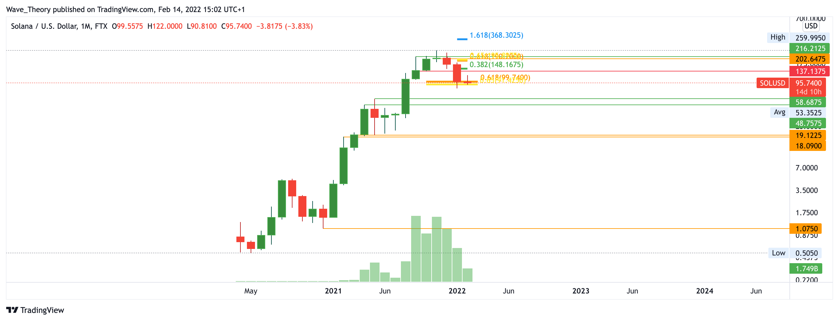 Die nächsten Fibonacci Niveaus liegen bei rund 150 USD und 195 USD. Sollte Solana diese Widerstände brechen, so ist die Korrektur offiziell beendet und Solana könnte sich zum ATH bei rund 260 USD aufmachen. Das nächste Fib Niveau findet der SOL Kurs anschließend bei rund 370 USD.