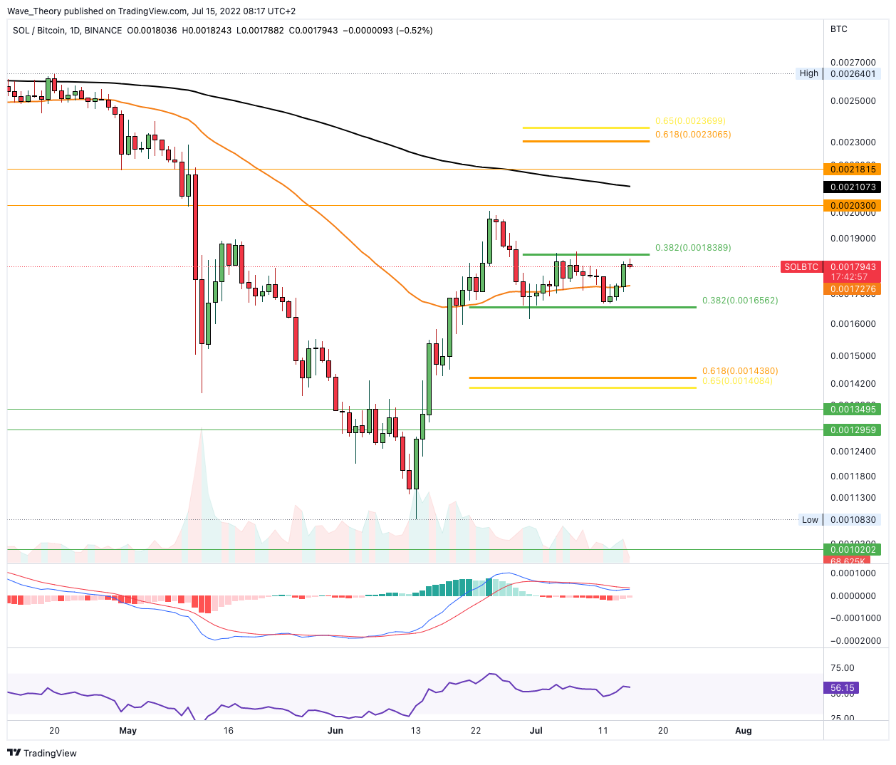 Gegen BTC kämpft der Solana Kurs mit dem 0,382 Fib Widerstand