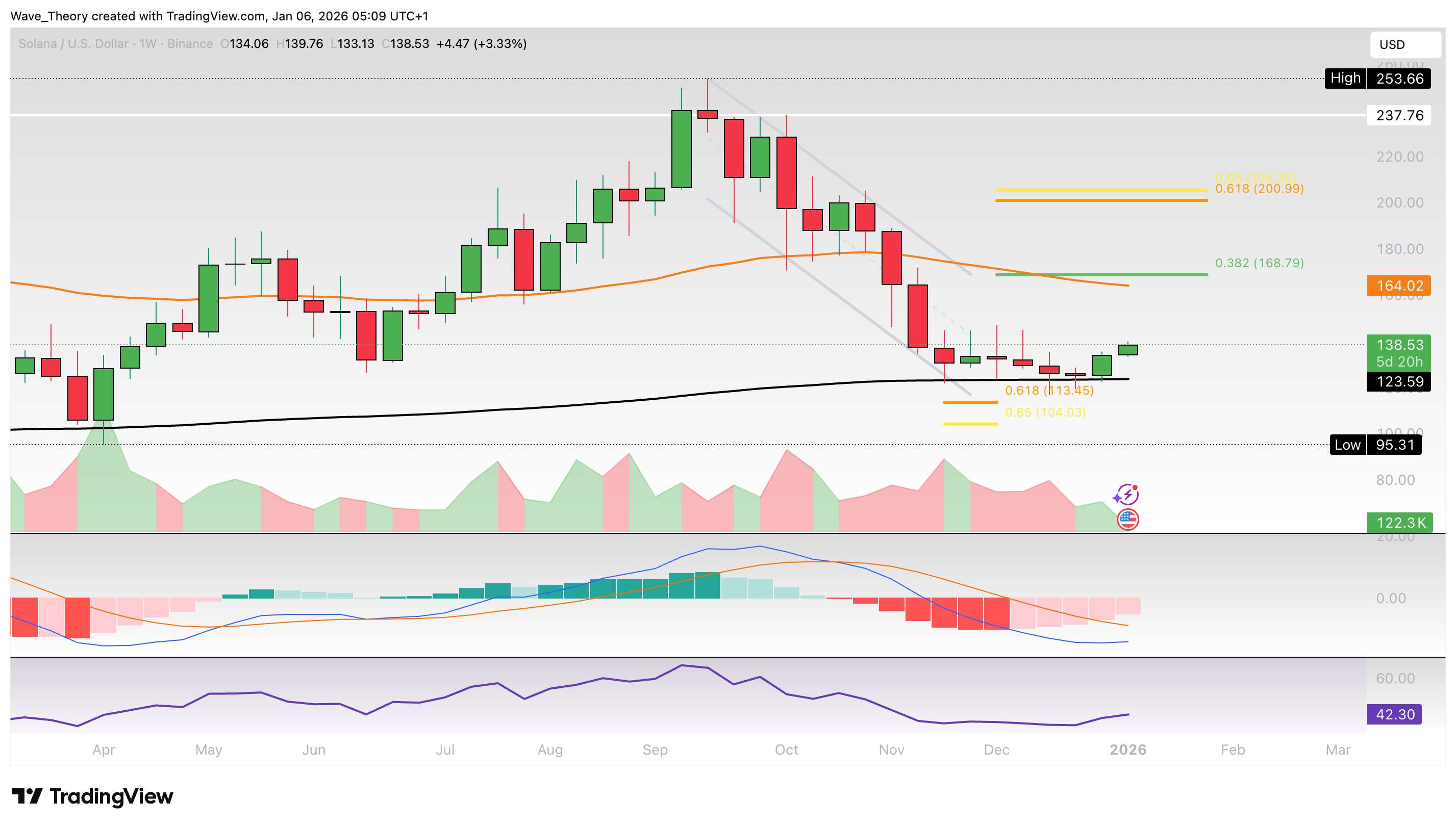 Solana-Prognose für Dienstag, 06. Januar, 2026: Der Solana Kurs hat das Korrekturziel am 50-Monate-EMA bei rund 116 USD abgeholt.