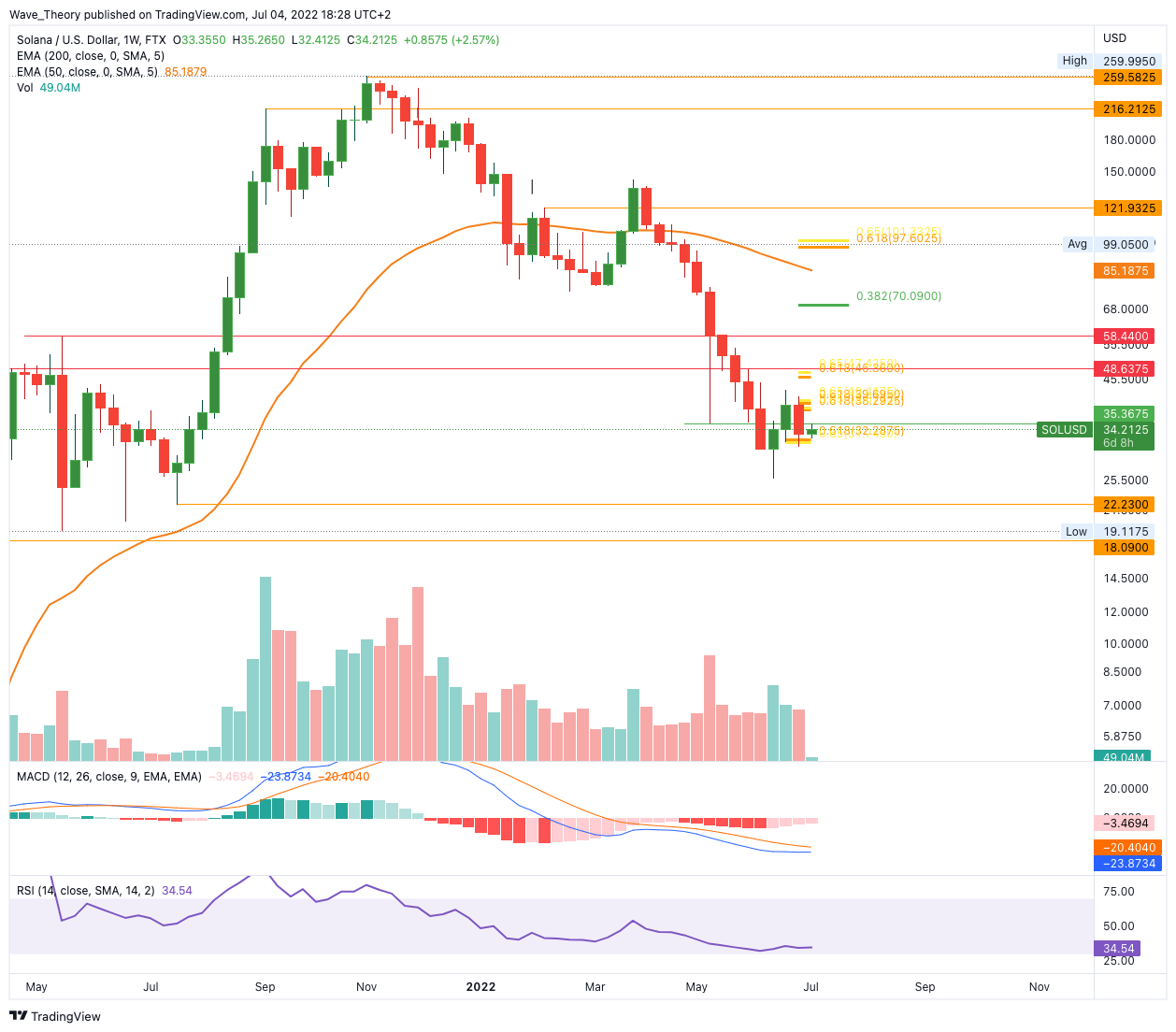 Setzt Solana jetzt die Aufwärtsbewegung fort, besteht die Chance, dass Solana bei rund 25 USD den Boden gefunden hat. Jedoch warten nun einige Widerstände auf den Solana Kurs, denn zwischen 48 – 58 USD wartet signifikanter horizontaler Widerstand auf Solana.
