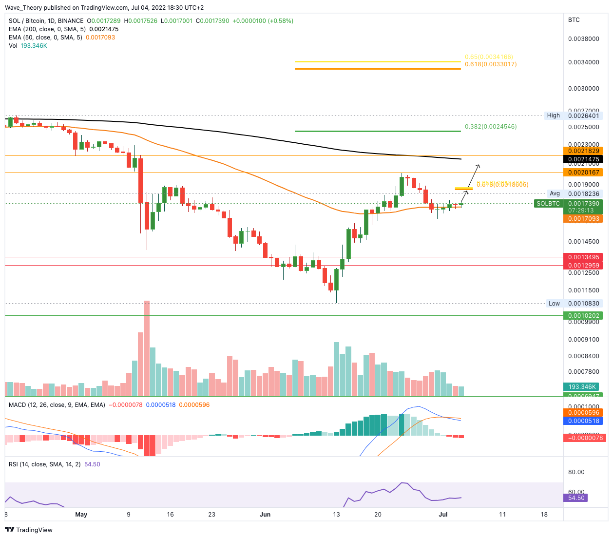 Bricht Solana diesen Widerstand, könnte Solana zum horizontalen Widerstand zwischen 0,002- 0,0022 BTC steigen, wodurch zusätzlich der 200-Tage-EMA verläuft. Auf den nächstgrößten Fib Widerstand stößt Solana aber erst bei rund 0,00245 BTC.