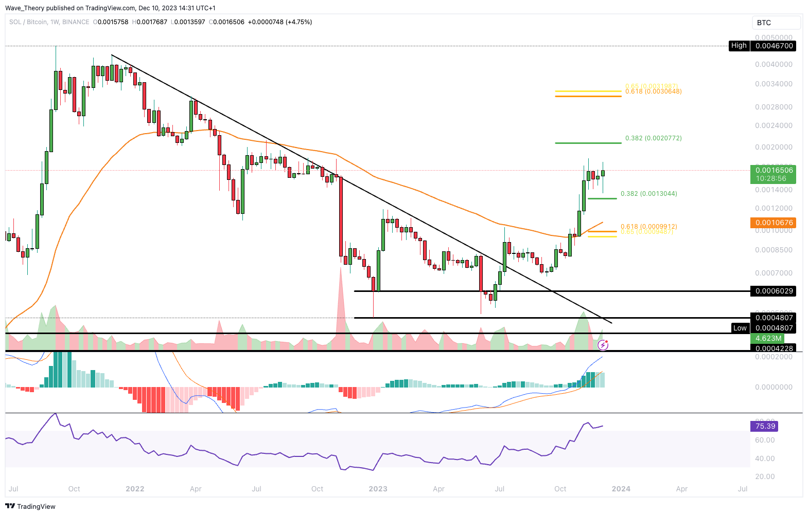 Gegen Bitcoin befindet sich der SOL Kurs auf dem Weg zum 0,382 Fib Widerstand bei rund 0,00207 BTC