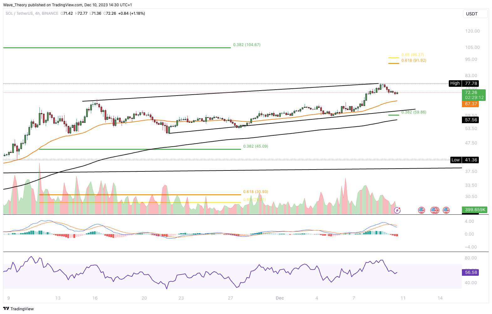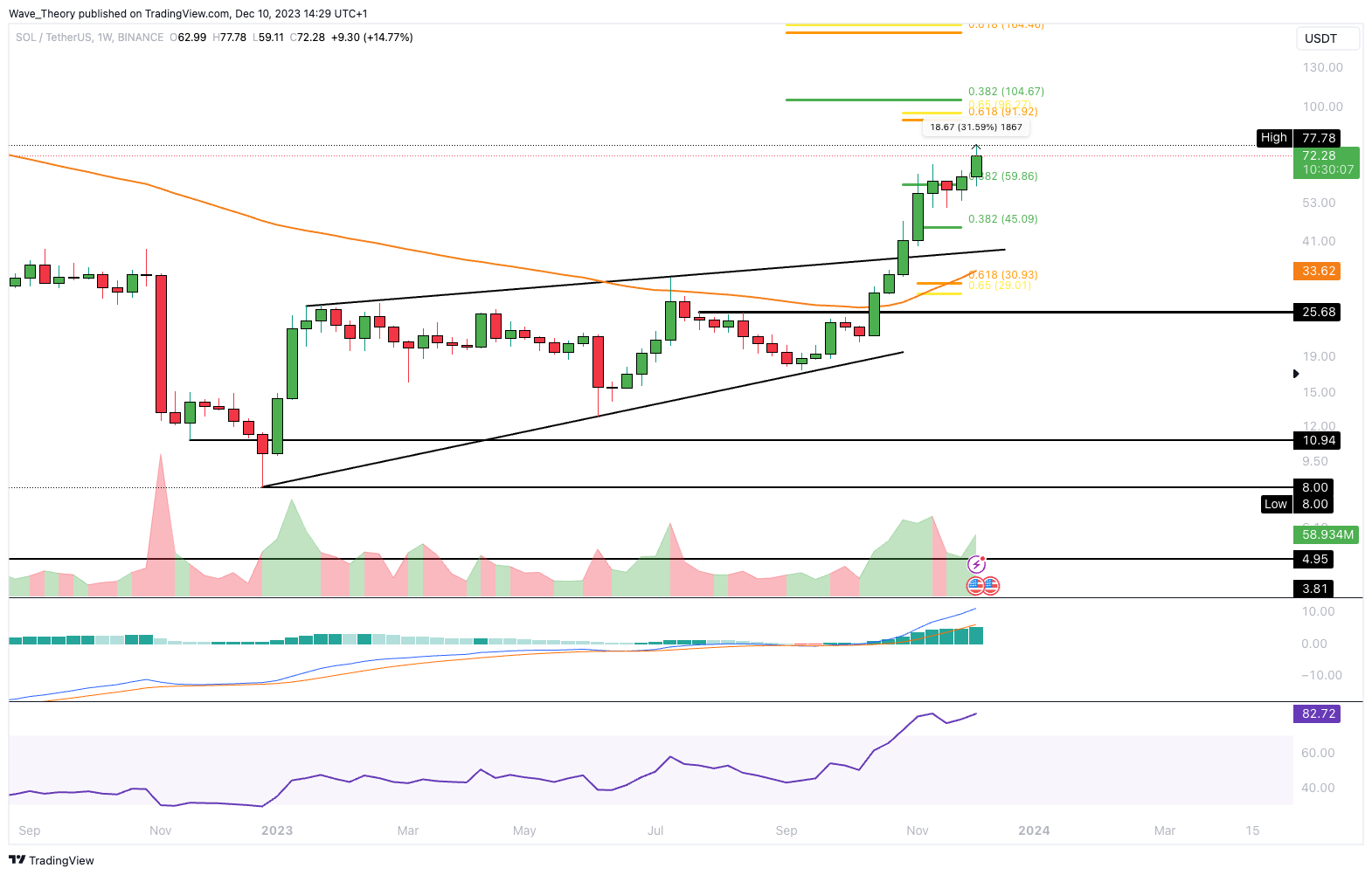 Der SOL Kurs konnte in dieser Woche bereits über 31,6 % steigen und den 0,382 Fib Widerstand bei rund 60 USD weit hinter sich lassen. Damit stehen nun knapp 91 – 96 USD in Aussicht.