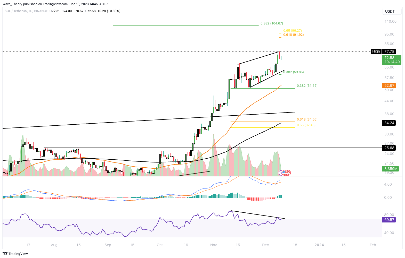 Sollte der SOL Kurs jetzt korrigieren, warten bei rund 51 USD und bei rund 34 USD die nächsten signifikanten Fib Unterstützungen. Bei rund 53 USD fungiert der 50-Tage-EMA als zusätzliche Unterstützung und bei rund 34 USD der 200Tage-EMA.