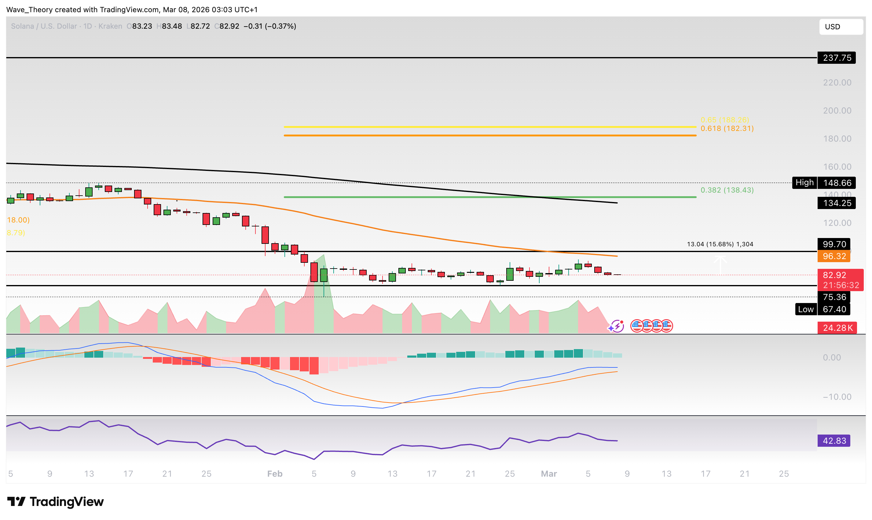 SOL bewegt sich weiterhin seitwärts in der wichtigen Unterstützungszone zwischen 75 USD und 100 USD. Solange diese hält, besteht Chancen auf eine Erholung. Ein Bruch könnte jedoch einen starken Abverkauf bis zur nächsten großen Unterstützung bei rund 8 USD auslösen.