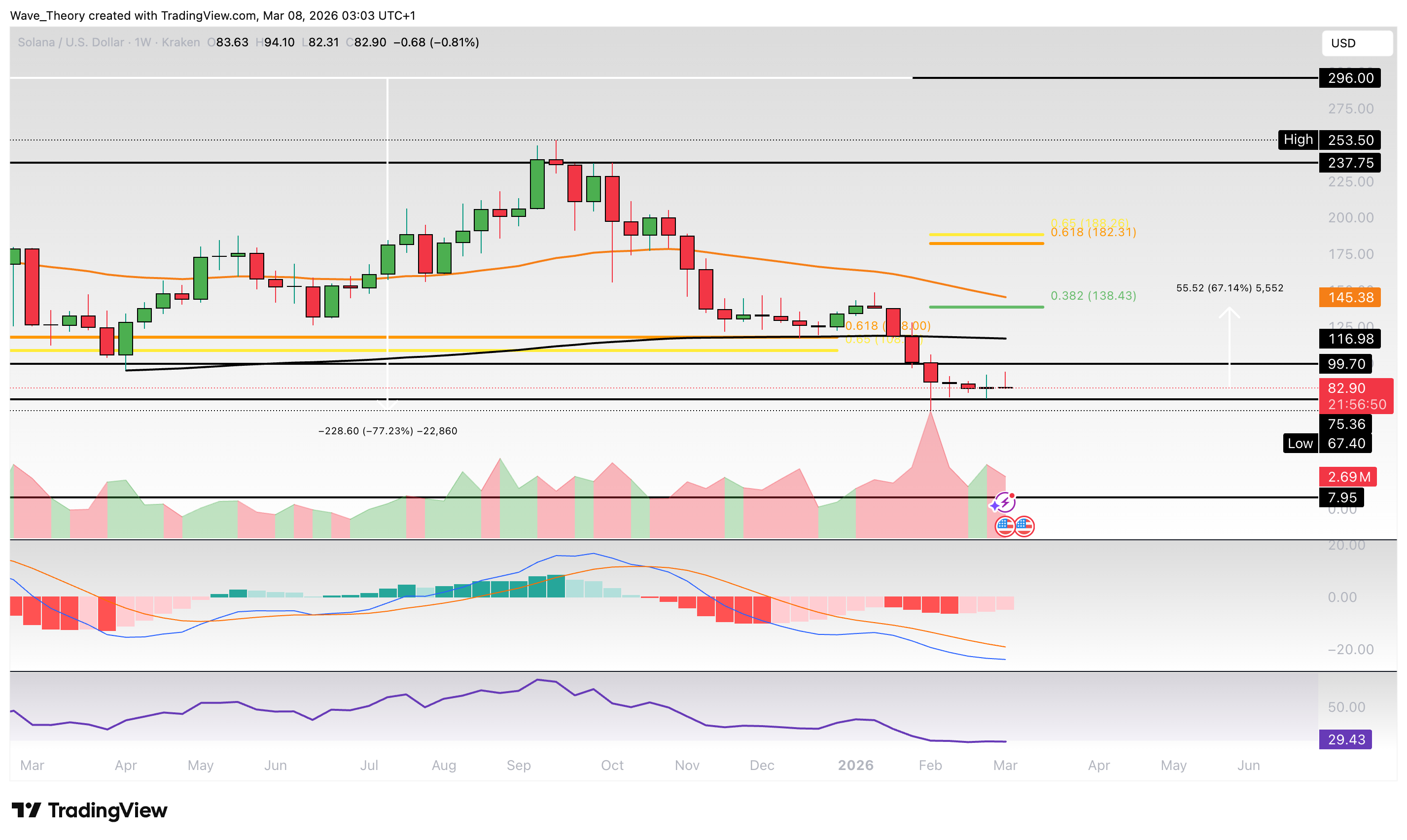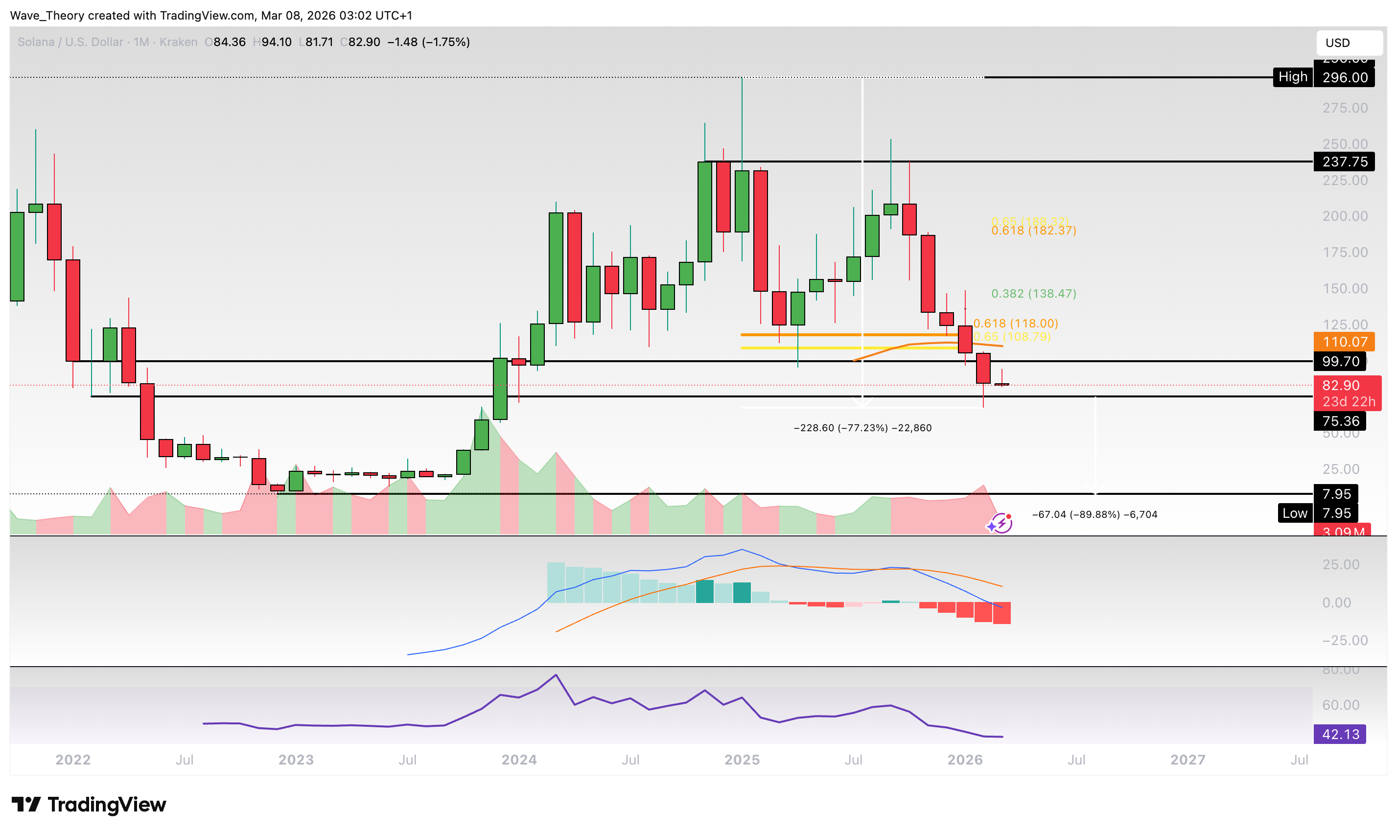 Wichtige Widerstände liegen bei 96 USD, 110–117 USD, 134 USD, 138 USD und vor allem bei 185 USD (Golden Ratio). Erst über 185 USD wäre der Abwärtstrend beendet.