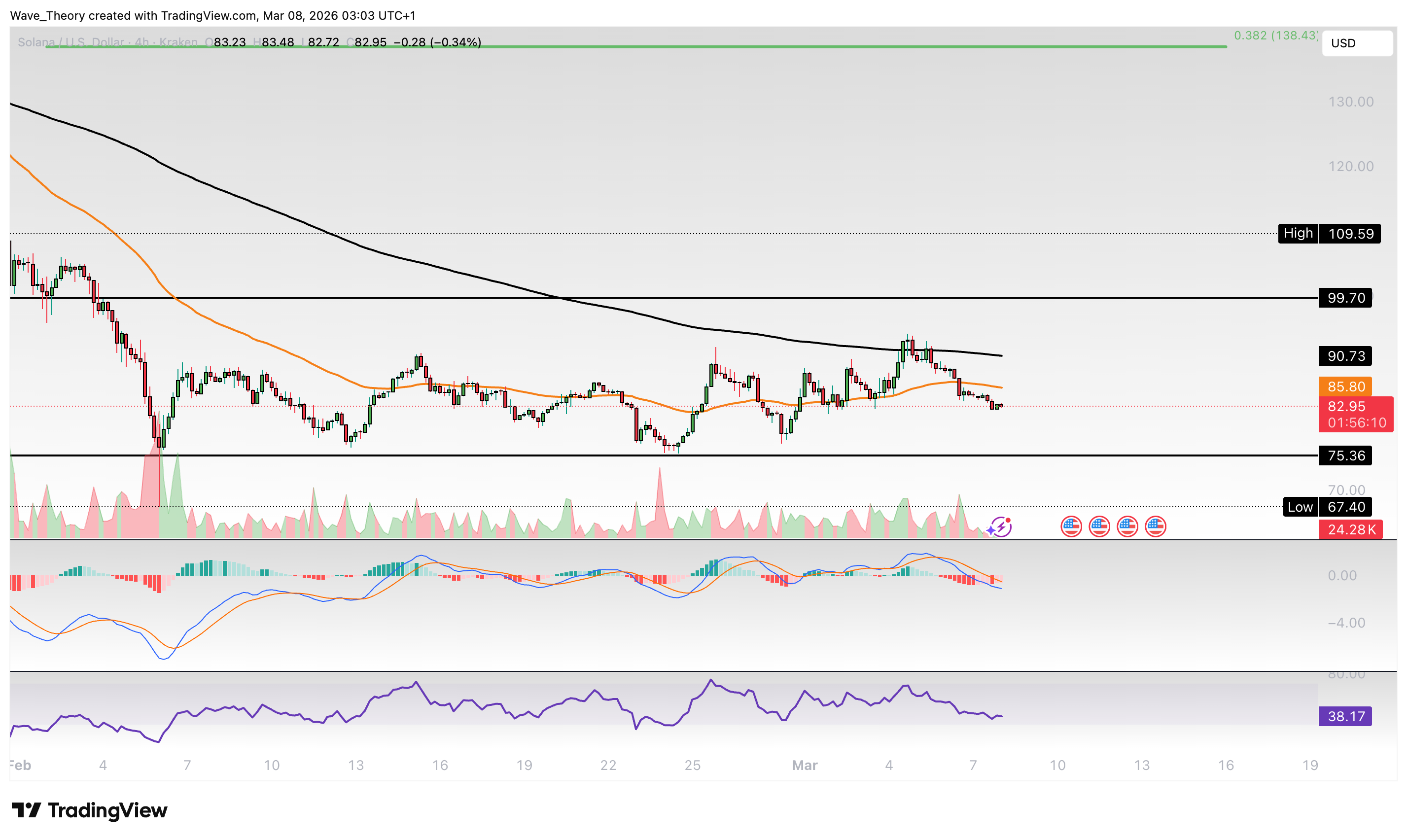 Im 4H-Chart geben die Indikatoren eher bärische Signale für den Solana Kurs