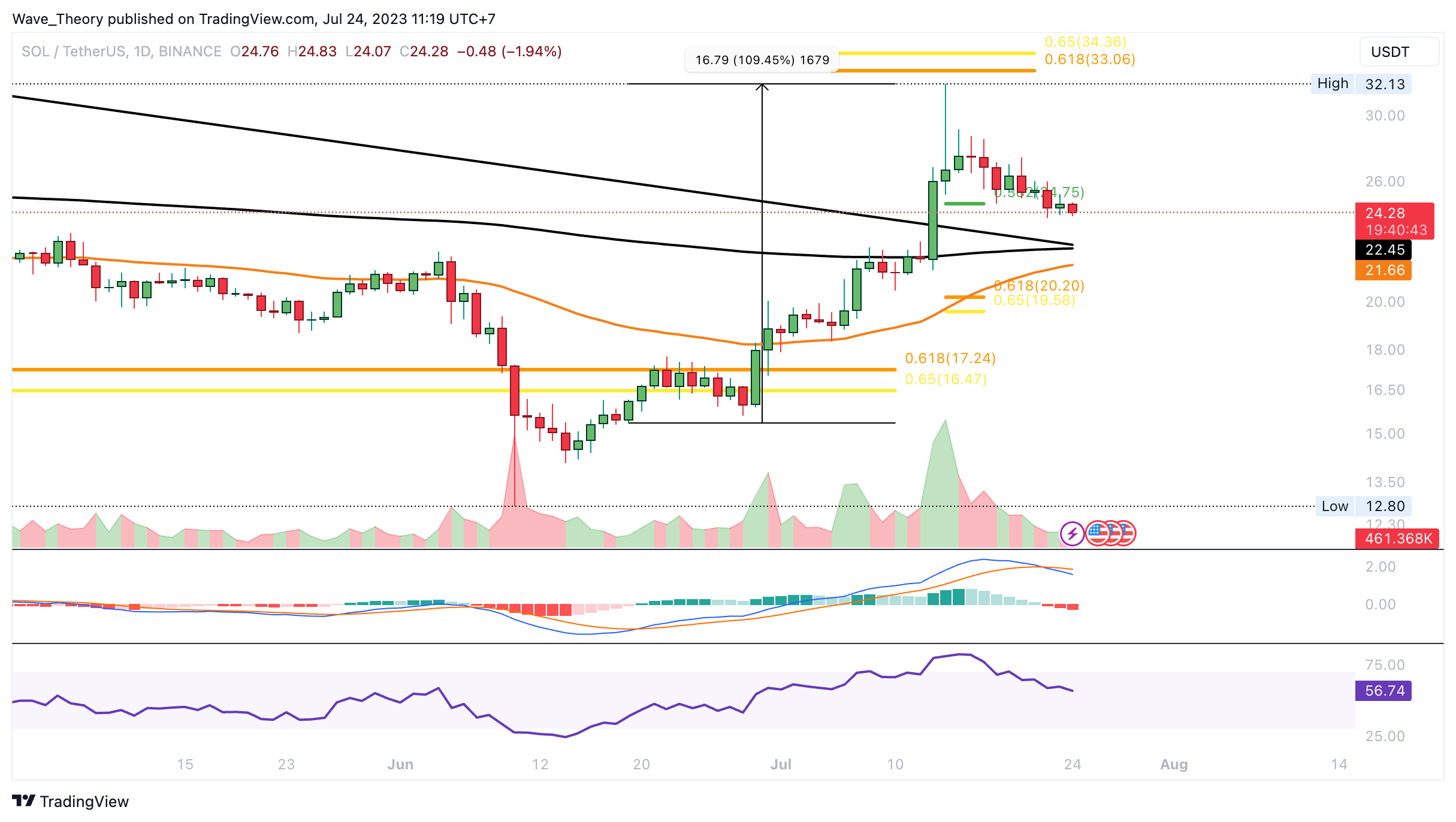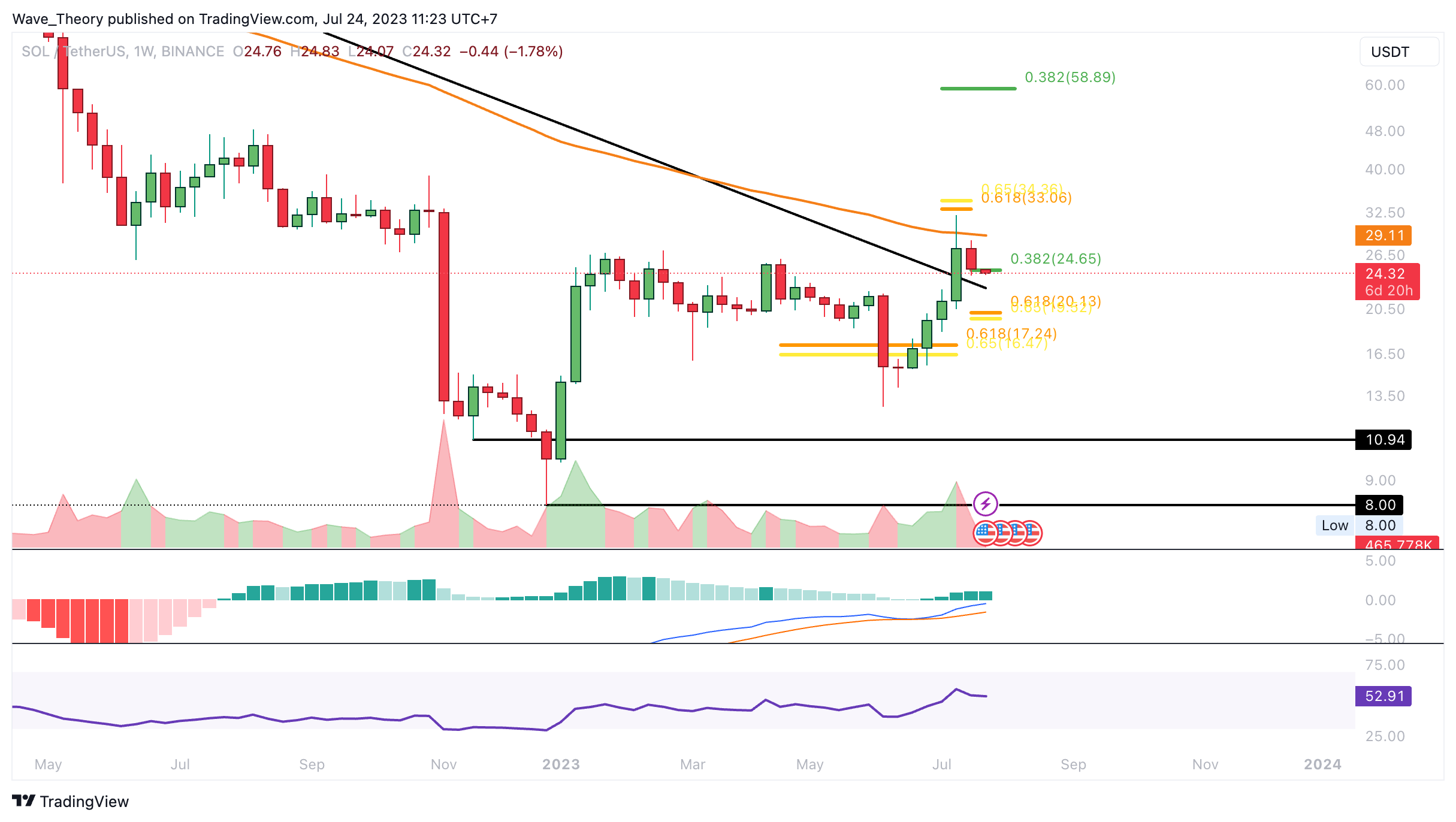 Nichtsdestoweniger tickt das Histogramm des MACDs immer noch bullisch höher und auch die MACD Linien bleiben im Wochenchart bullisch überkreuzt. Der Solana Kurs könnte an der Golden Ratio Unterstützung bei rund 20 USD abprallen, um die Aufwärtsbewegung fortzusetzen.