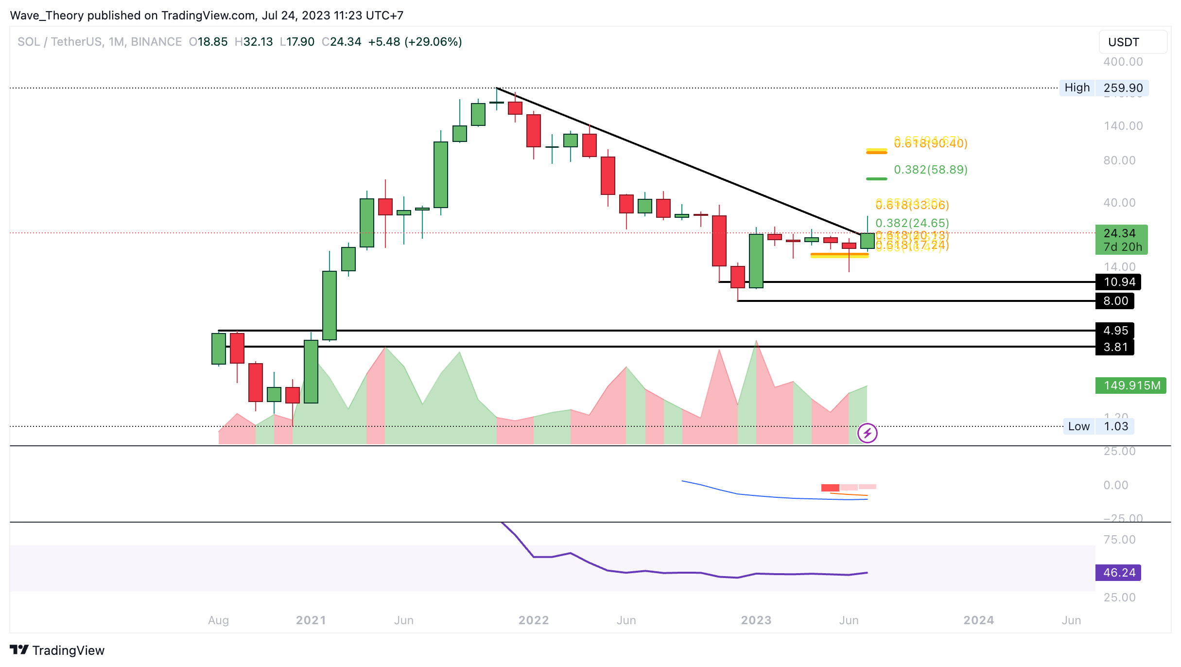 Im Monatschart entwickelt sich die Monatskerze aktuell bärisch. Denn tatsächlich könnte die Monatskerze unter der bärischen Trendlinie schließen, wenn Solana zum Monatsende nicht über dem aktuellen Preisniveau von rund 24,3 USD steht.
