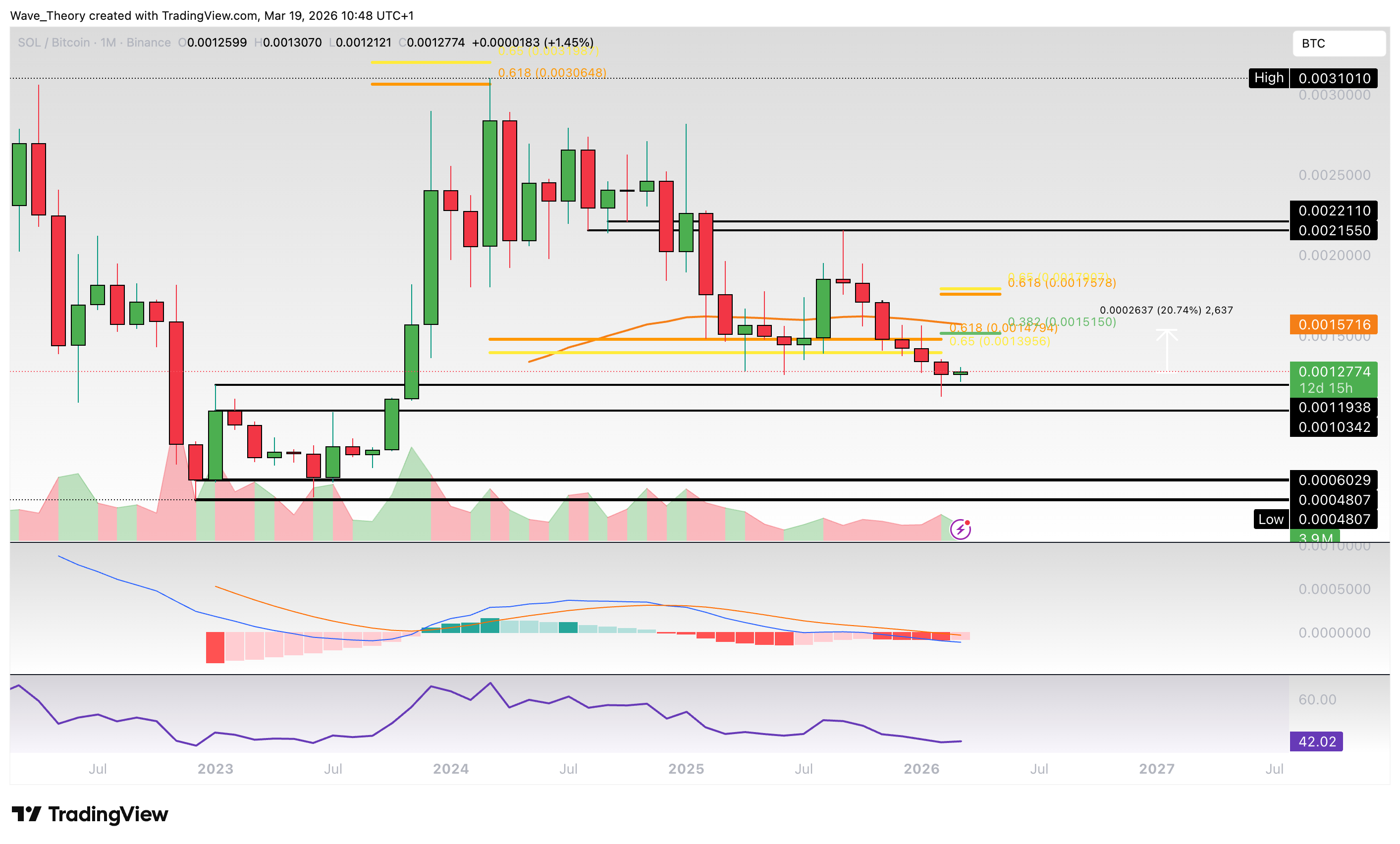 Auch im Handelspaar gegen BTC ist Solana zunächst unter die wichtige Golden Ratio bei rund 0,00145 BTC gefallen. Dennoch konnte der Kurs im vergangenen Monat über der Unterstützungszone zwischen etwa 0,001034 BTC und 0,0012 BTC schließen, womit der Kurs in diesem Monat bullisch abzuprallen scheint.