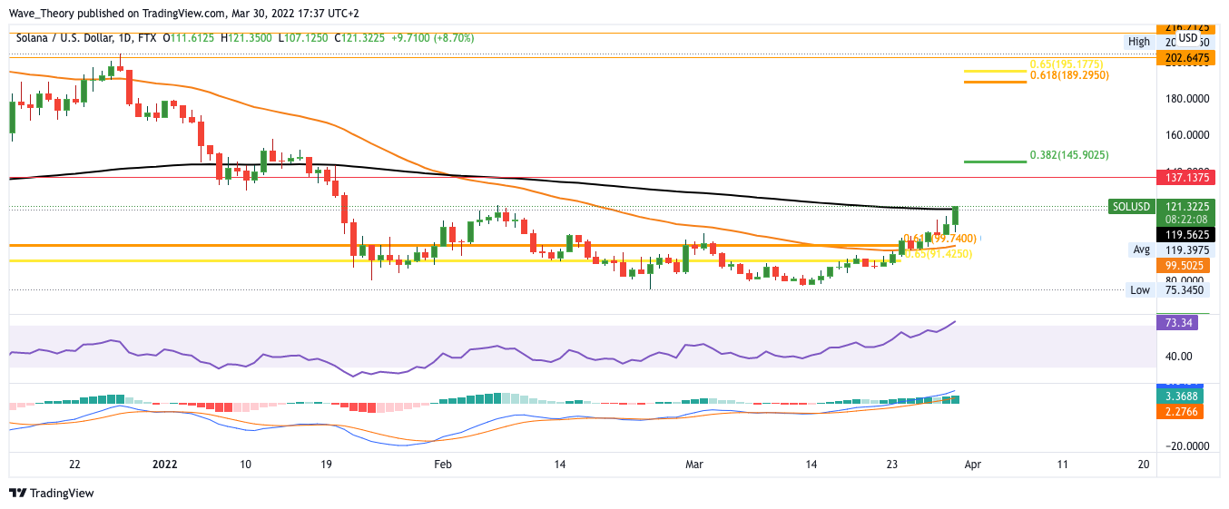 In rund zwei Wochen konnte der Solana Kurs rund 60 % in die Höhe schießen. Dabei stößt der SOL Kurs jetzt auf Widerstand am 200-Tage-EMA. Bricht Solana diesen, könnte der SOL Preis bis zum 0,382 Fib Niveau bei rund 150 USD steigen, knapp 20 % über dem aktuellen Preisniveau. Wird dieser Widerstand ebenfalls gebrochen, könnte Solana sogar bis zur Golden Ratio bei rund 200 USD steigen. Dort liegt der entscheidende Schlüsselwiderstand, welcher Solanas Kurstrend entweder bärisch bestätigen oder zu einem bullischen Trendwechsel veranlassen wird. Im Tageschart zeigt sich der MACD jedenfalls eindeutig bullisch, denn das Histogramm tickt bullisch höher, während die MACD Linien bullisch überkreuzt sind.
