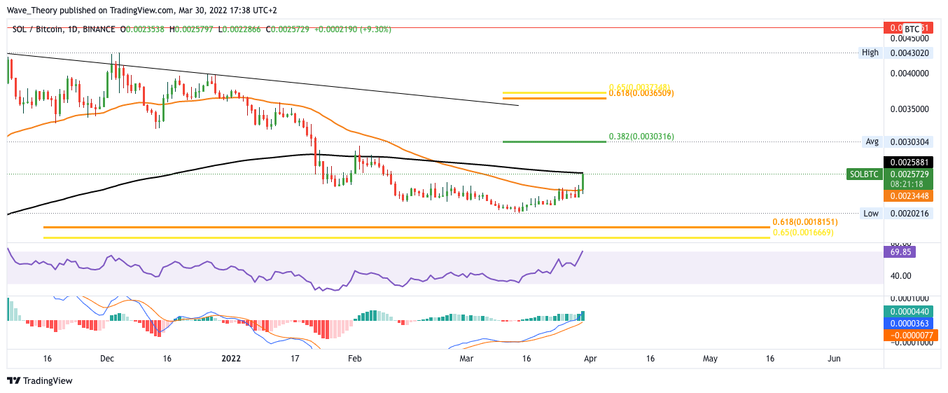 Auch gegen BTC befindet sich der Solana Kurs am 200-Tage-EMA