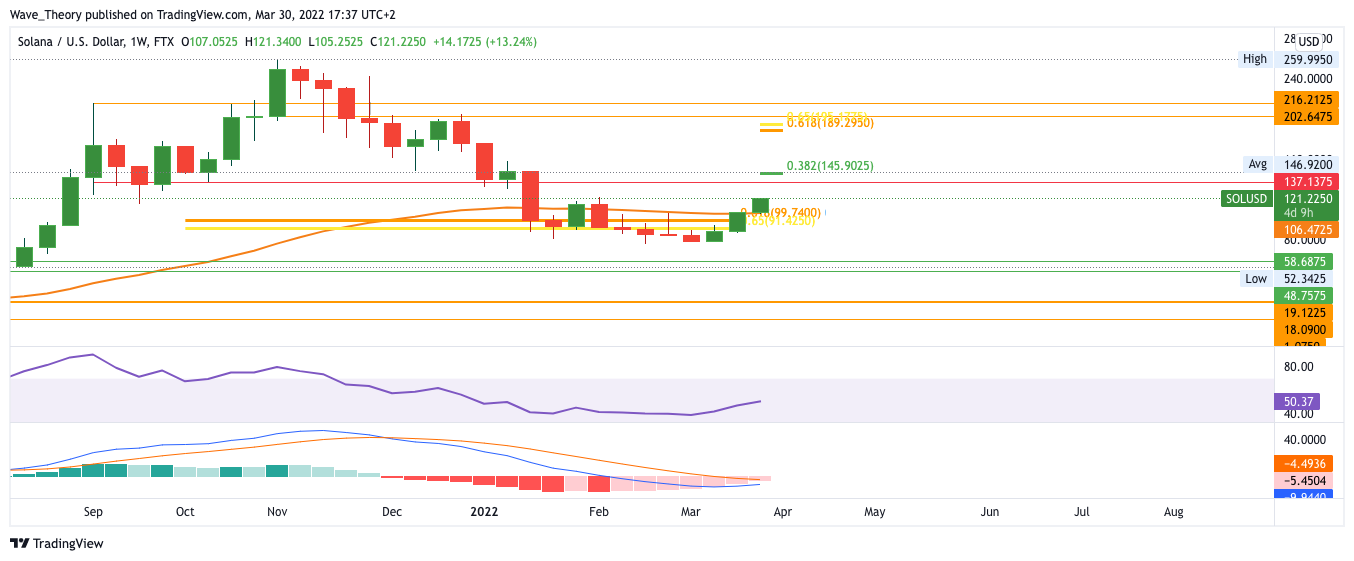 Auch im Wochenchart sieht es sehr gut aus für den SOL Kurs. Das ist die dritte bullische Woche für Solana und auch der MACD zeigt sich im Wochenchart eindeutig bullisch, denn das Histogramm tickt seit einigen Wochen bullisch höher.