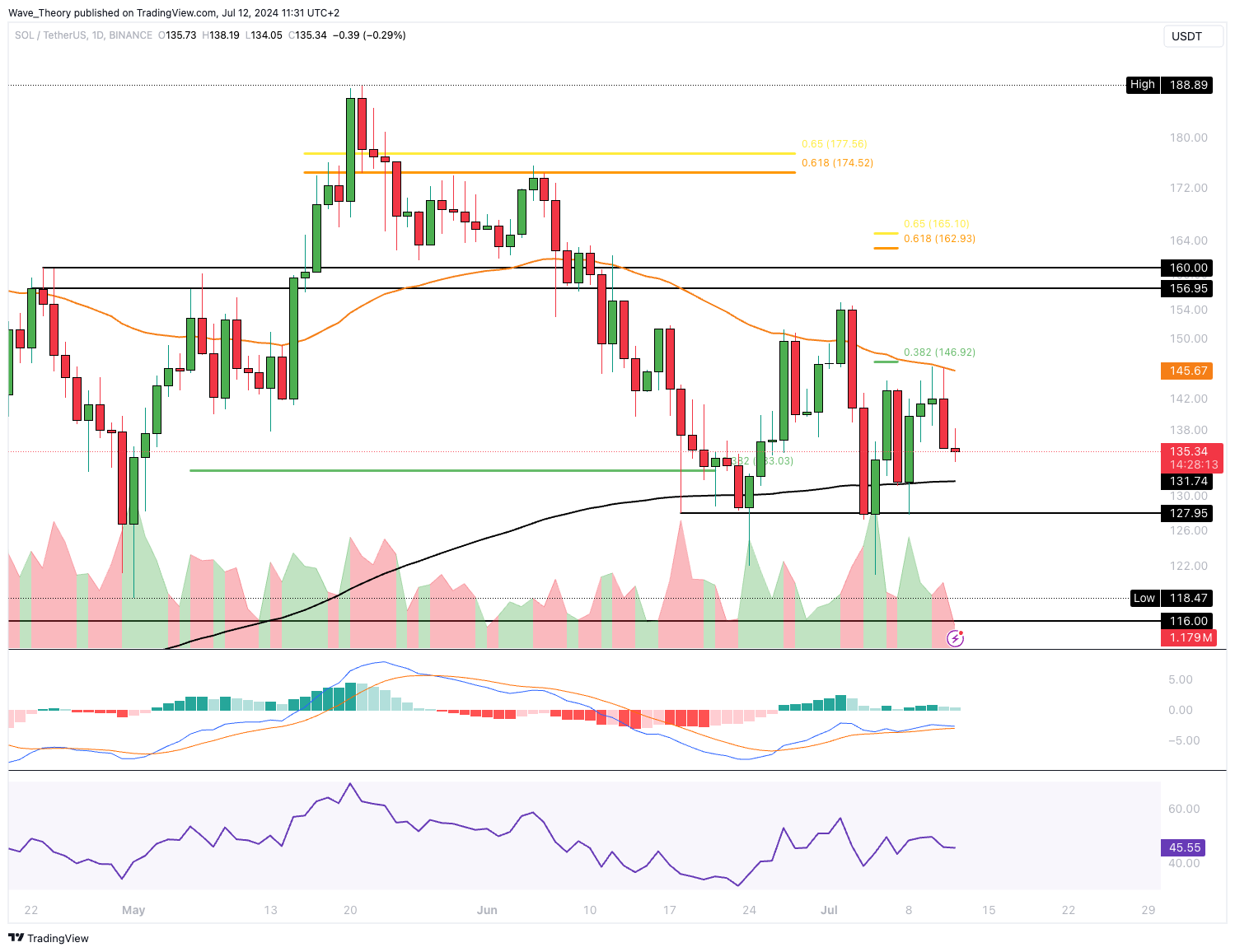 Ansonsten wartet nach wie vor bei rund 128 USD signifikante Unterstützung auf den SOL Kurs. Solana stößt spätestens zwischen rund 116 USD und 128 USD auf signifikante Unterstützungszone.