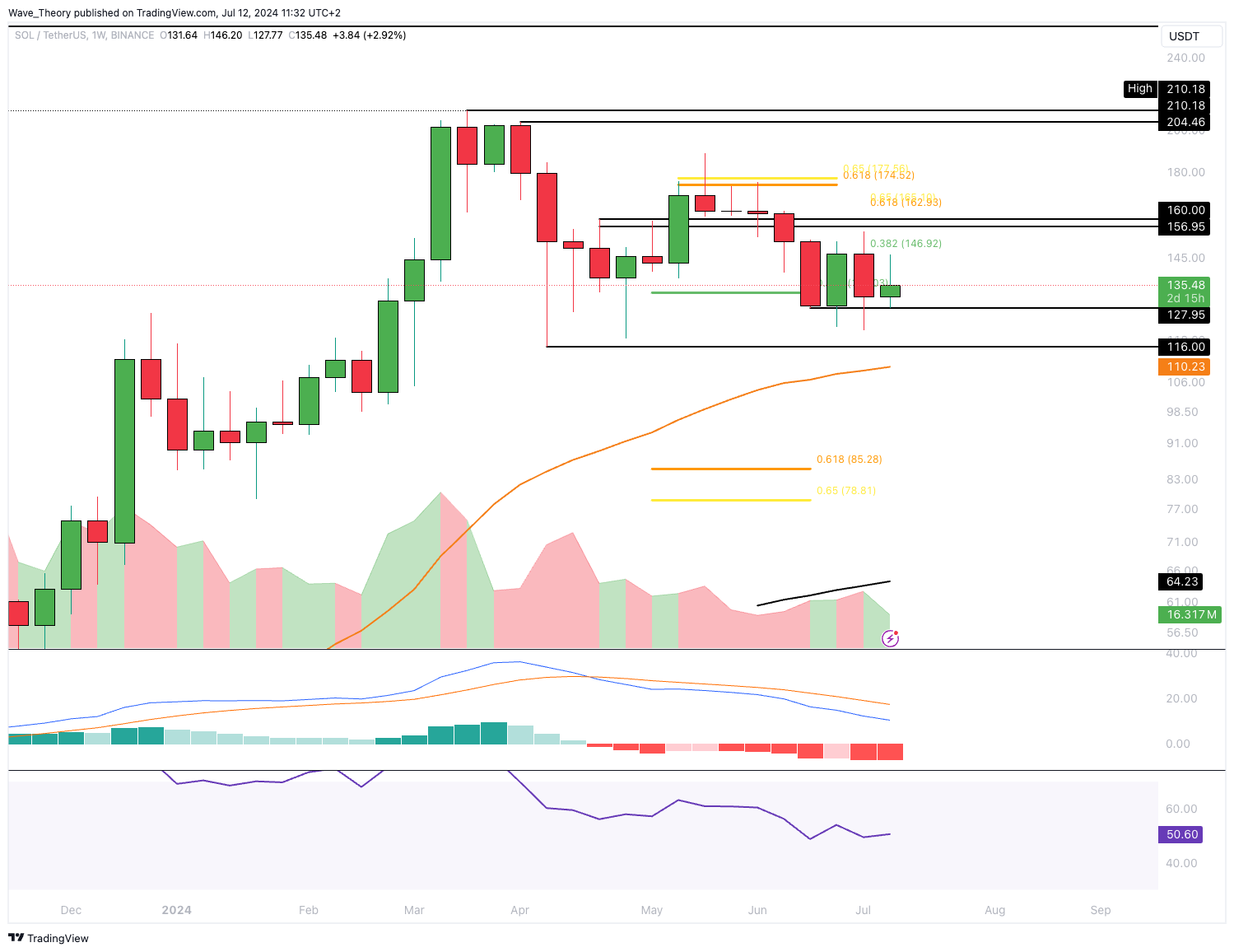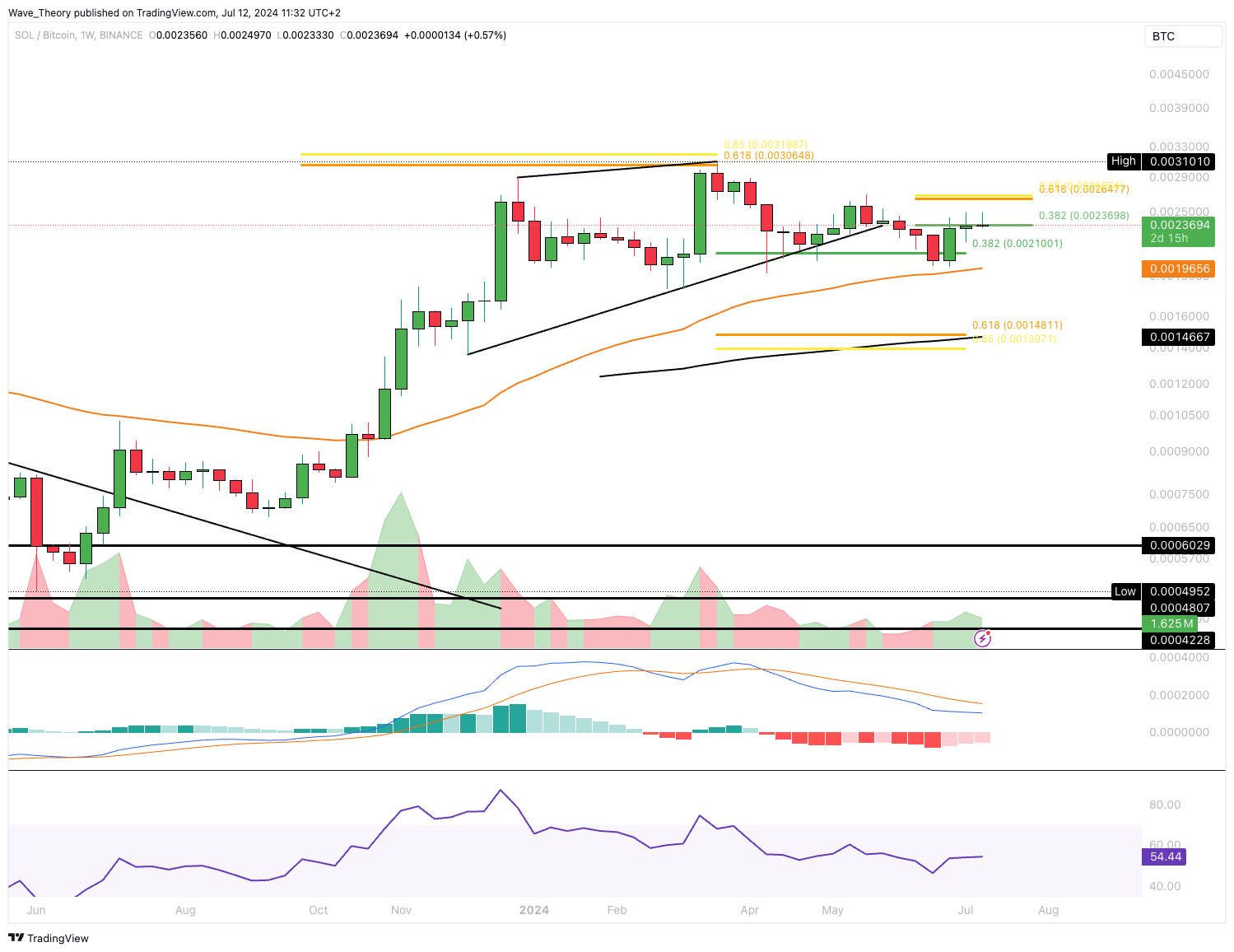 Sollte Solana bärisch abgewiesen werden, wartet spätestens am 50-Wochen-EMA bei rund 0,00196 BTC signifikante Fib Unterstützung.