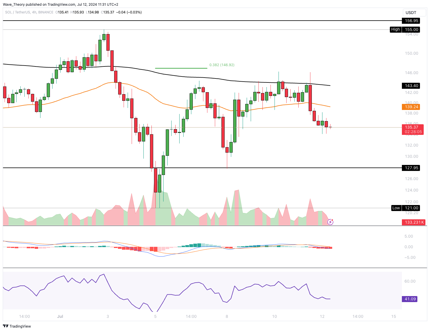 Im 4H-Chart von Solana hat sich hingegen ein Death Cross geformt, womit der Trend kurzfristig bärisch bestätigt ist. Zudem sind auch die MACD Linien bärisch überkreuzt und das Histogramm des MACDs weist einen Abwärtstrend auf.