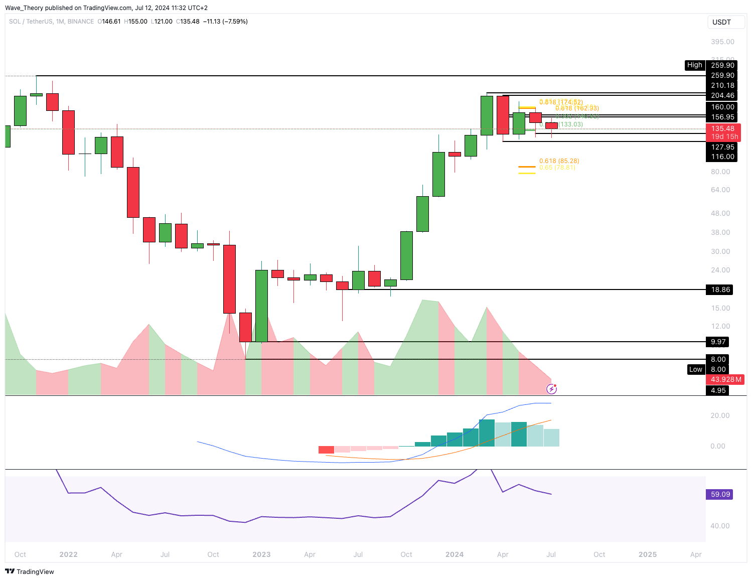 SponsoredAuch im Monatschart von Solana tickt das Histogramm des MACDs bärisch tiefer