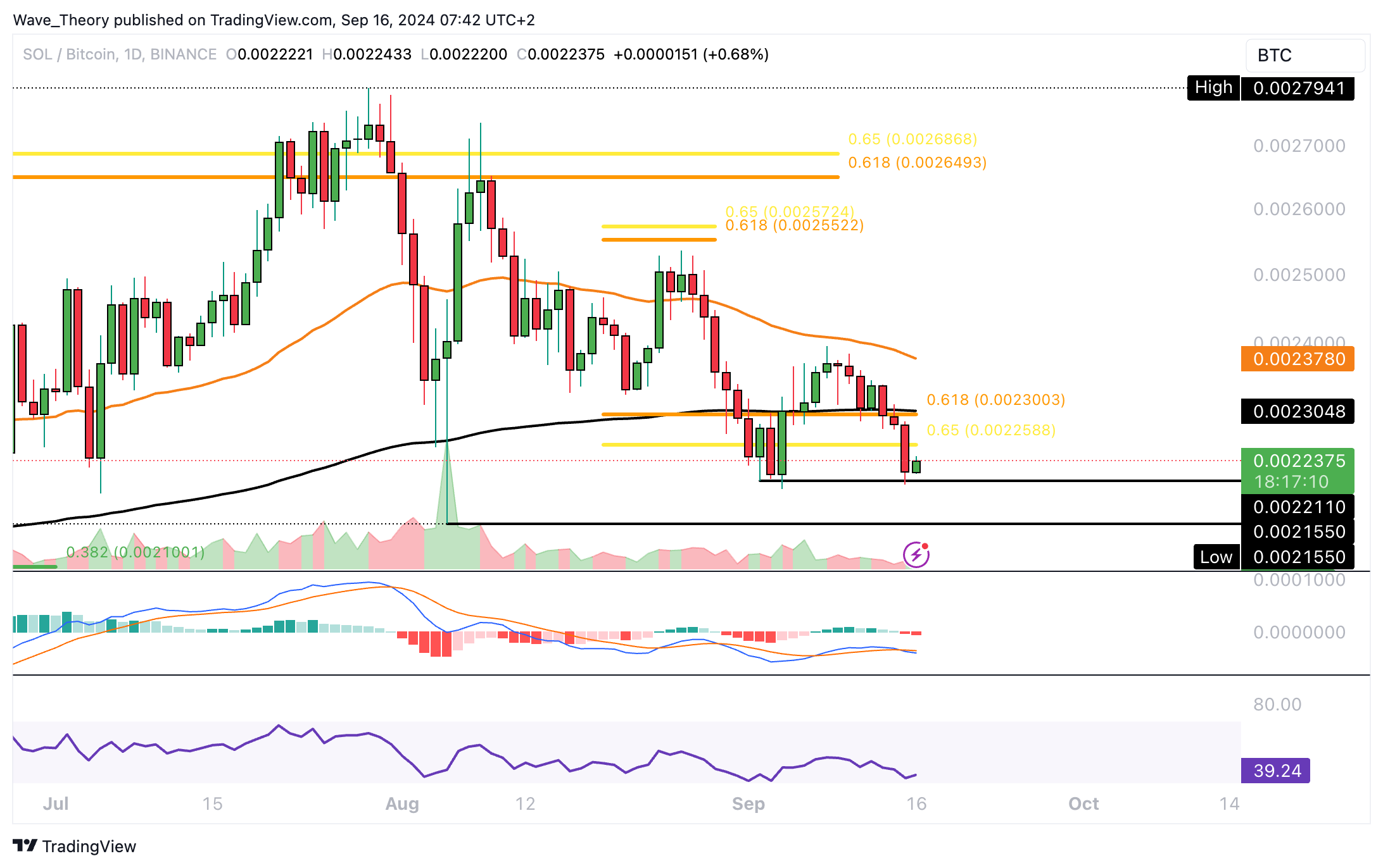 Gegen Bitcoin hat Solana die Golden Ratio Unterstützung bei rund 0,0023 BTC bärisch gebrochen. Damit findet Solana jetzt zwischen rund 0,002155 BTC und 0,00221 BTC Unterstützung.