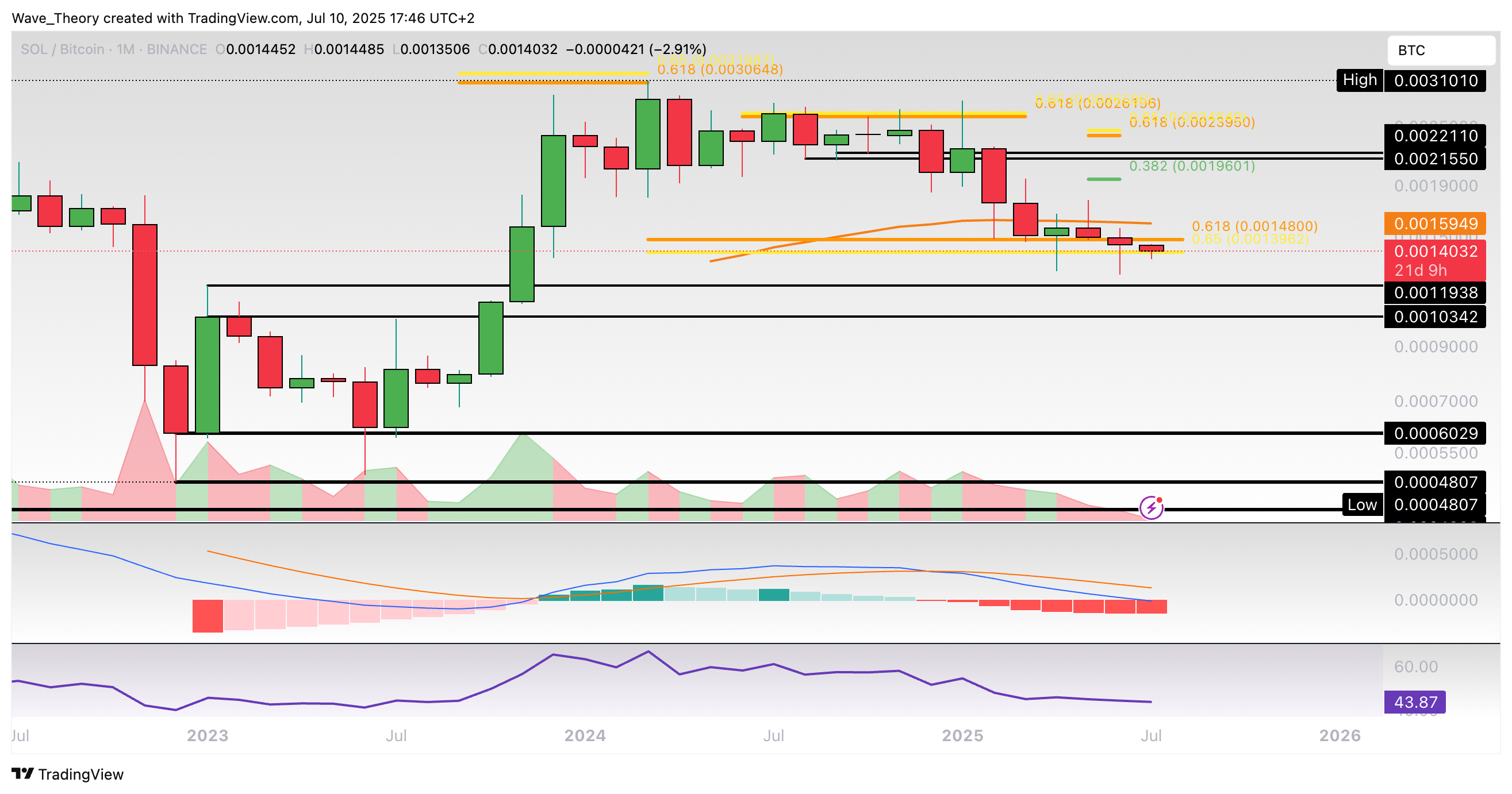 Nach oben hin findet Solana bereits am 50-Monate-EMA bei rund 0,0016 BTC signifikanten Widerstand.