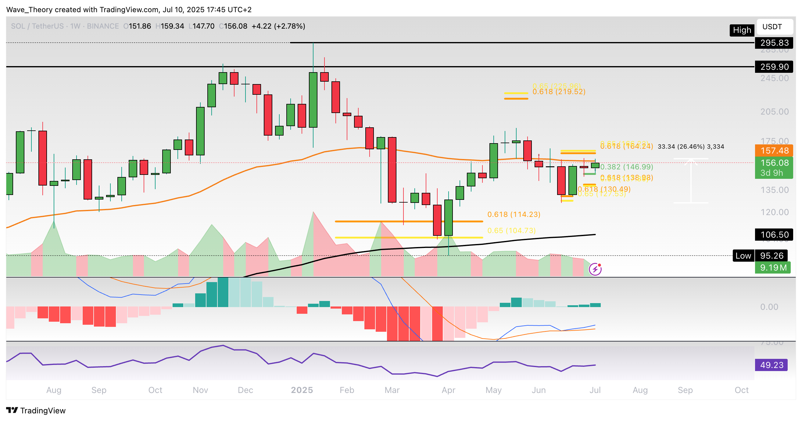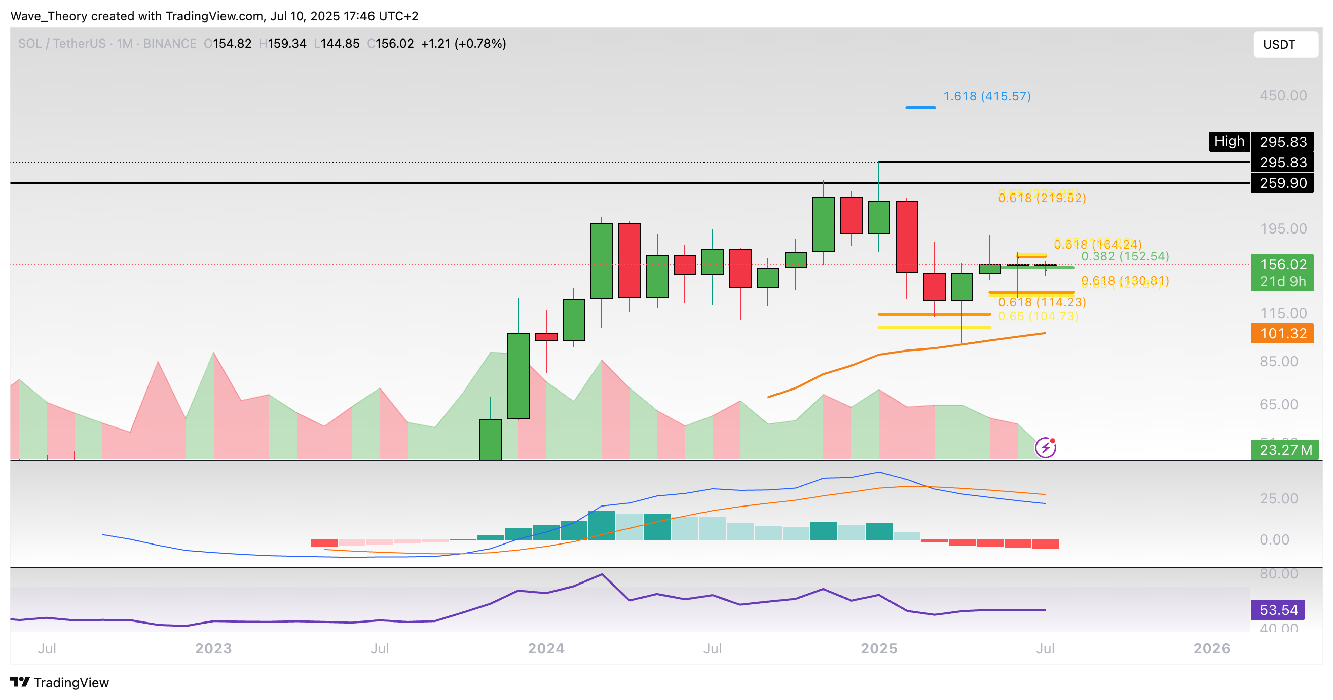 Im Monatschart wird ersichtlich, dass sich der Kurs die letzten zwei Monate erfolgreich über der 0,382 Fib Unterstützung bei rund 152,5 USD halten konnte. Sollte Solana diese Unterstützung bärisch brechen, warten bei rund 130 USD, 114 USD und 101 USD die nächsten signifikanten Unterstützungsniveaus.