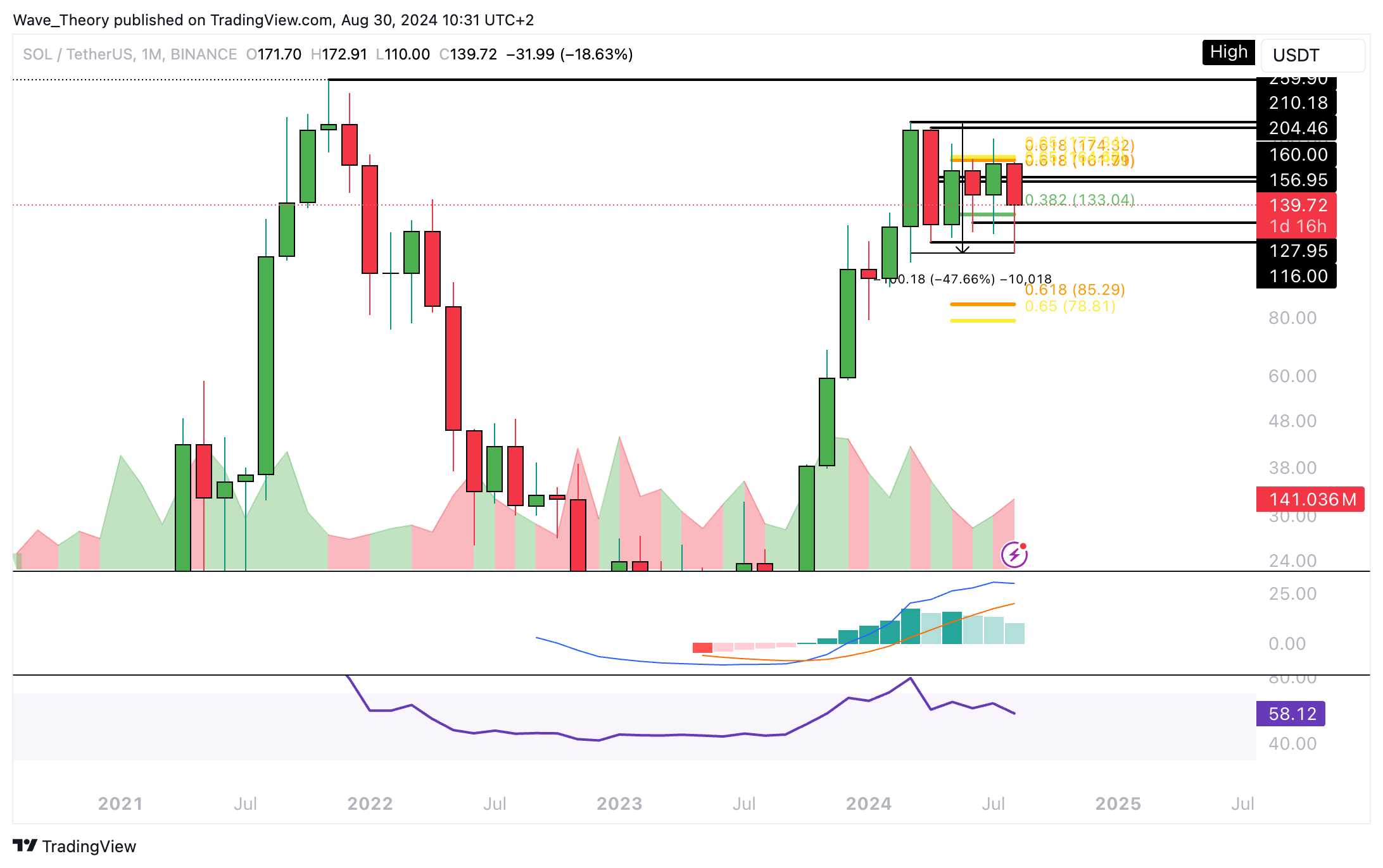 Insgesamt bleibt die in 2023 begonnene Aufwärtsbewegung bullisch intakt, solange sich Solana über der Golden Ratio bei rund 85 USD hält. Die Indikatoren geben dabei gemischte Signale im Monatschart.