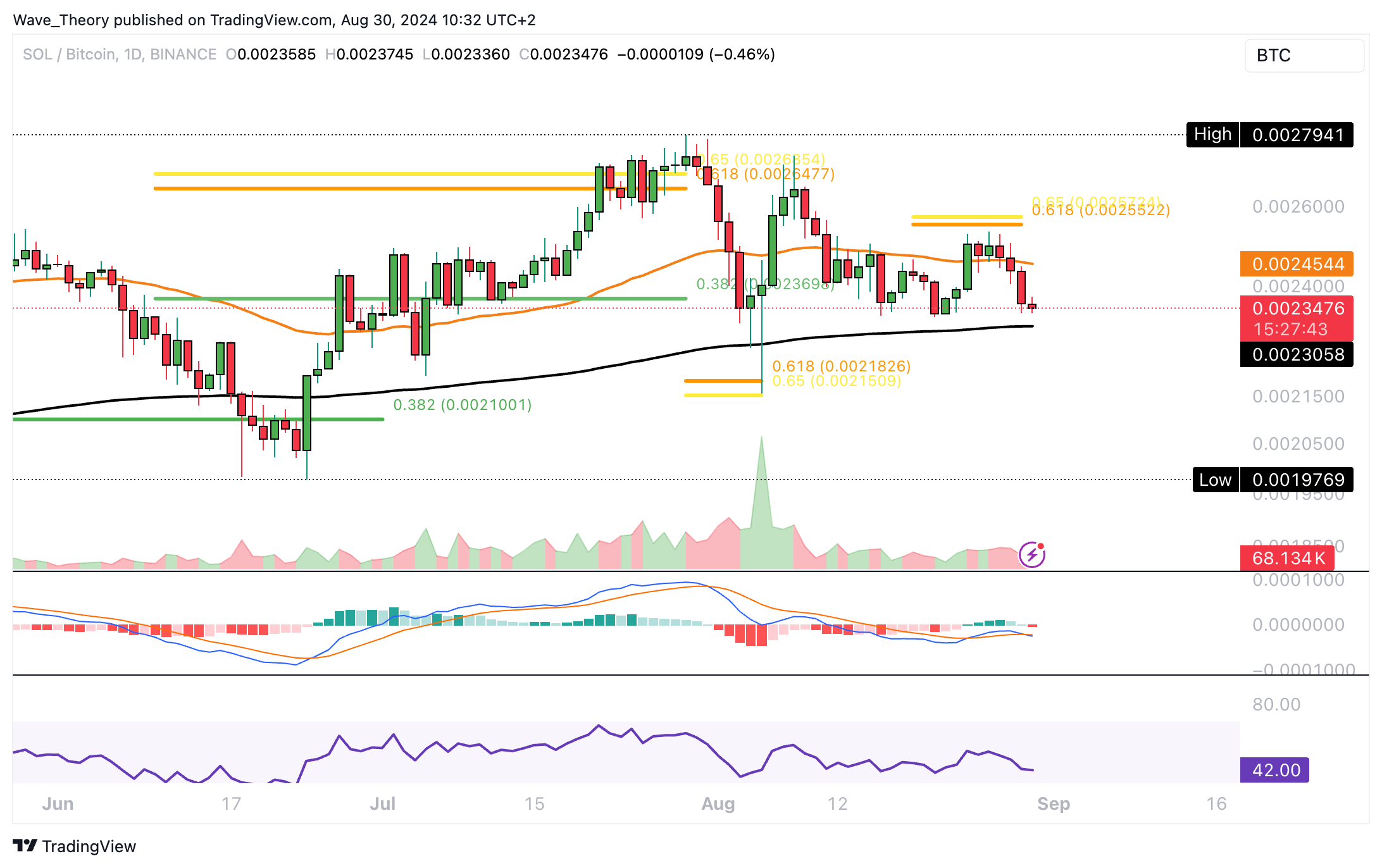 Auch gegen BTC wurde der SOL Kurs jetzt am Golden Ratio Widerstand bärisch abgewiesen, welcher sich bei rund 0,00255 BTC befindet. Damit könnte Solana jetzt erneut zur Golden Ratio bei rund 0,00215 BTC korrigieren.